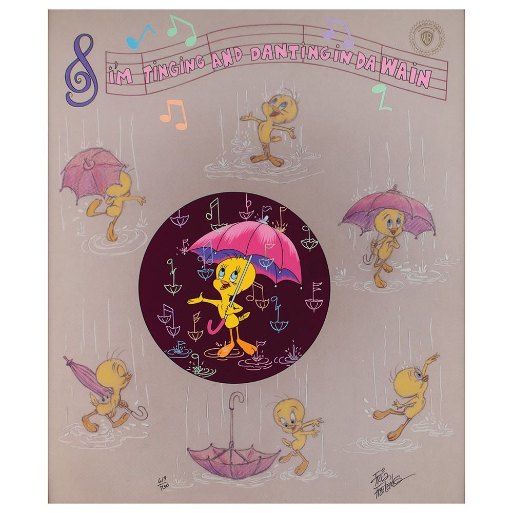 (Warner Brothers Studios, 1993) Original limited edition hand-painted cel featuring Tweety Bird entitled 'Singin' in da Wain,' numbered 619/750, signed in the lower right in black felt tip by Friz Freleng. The central image measures 8˝ in diameter, with overall dimensions of 19 x 22.5. The piece has the gold Warner Bros. seal to the upper right. In fine condition.