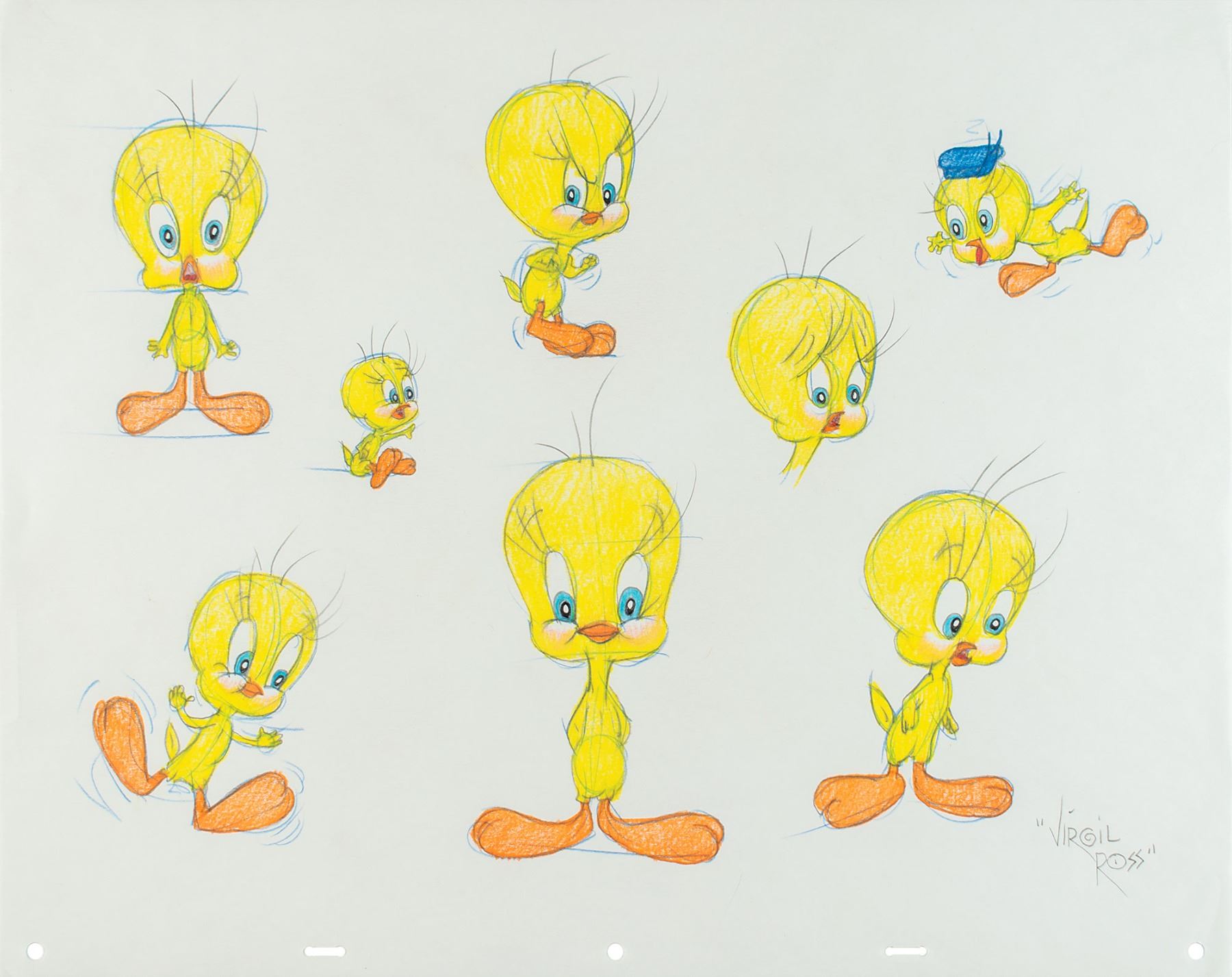 (Warner Brothers Studios, circa 1990s) Large original color model drawing by Virgil Ross featuring Tweety Bird in eight different poses. Accomplished in graphite and colored pencil on untrimmed 17 x 13.5 animation paper, signed at the bottom in pencil, "Virgil Ross." In fine condition. This one-of-a-kind drawing was done to be sold in the Warner Brothers Studio stores in the 1990s.