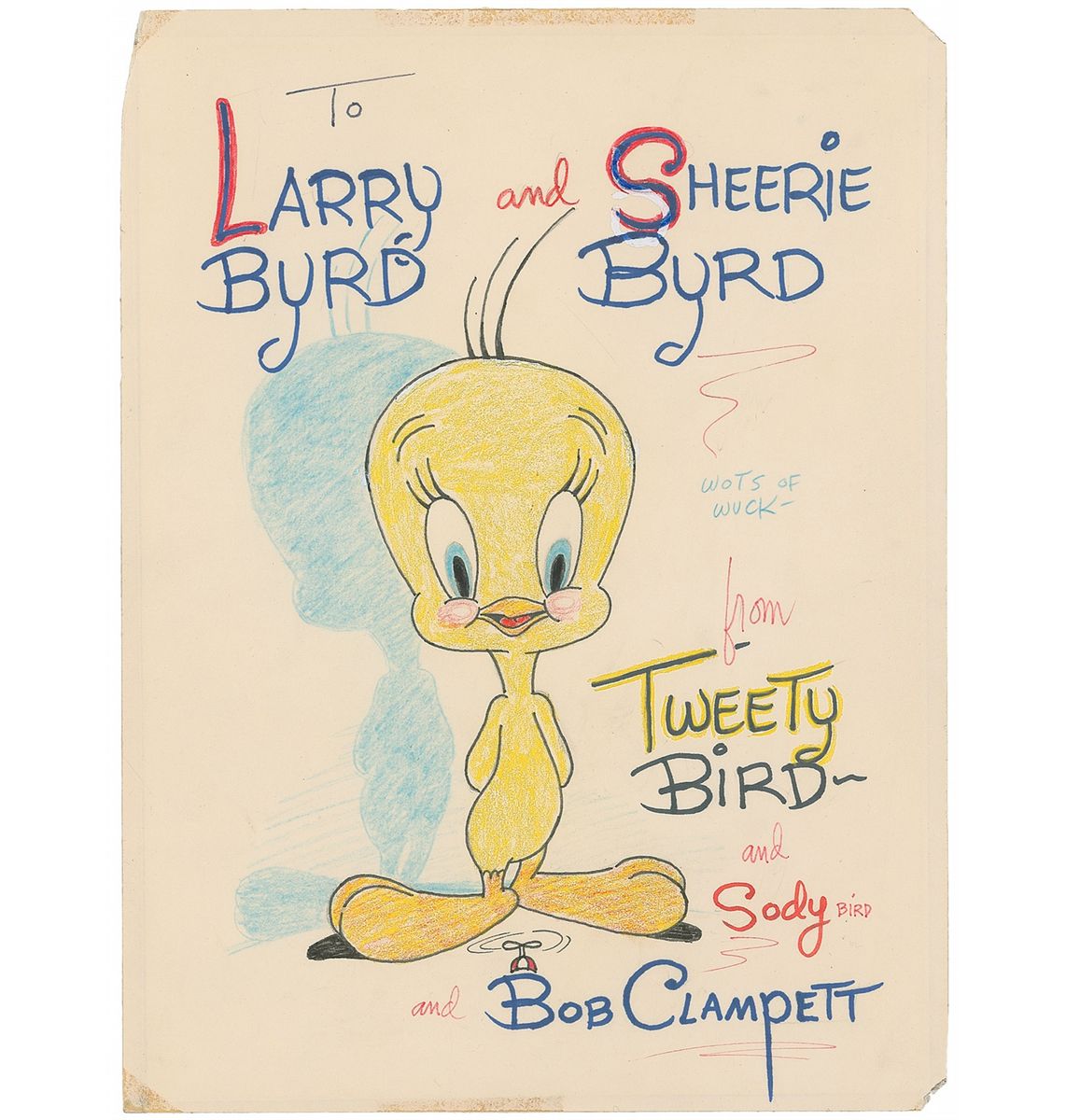 (Warner Brothers Studios, late 1950s) Original drawing featuring Tweety Bird, signed and inscribed in felt tip, “To Larry Byrd and Sheerie Byrd, Wots of wuck from Tweety Bird and Sody Bird and Bob Clampett.” Accomplished in felt tip and colored pencil on 9 x 12 illustration paper. Image measures 4 x 7. Small tears and toned tape remnants to corners and edges, otherwise fine condition.