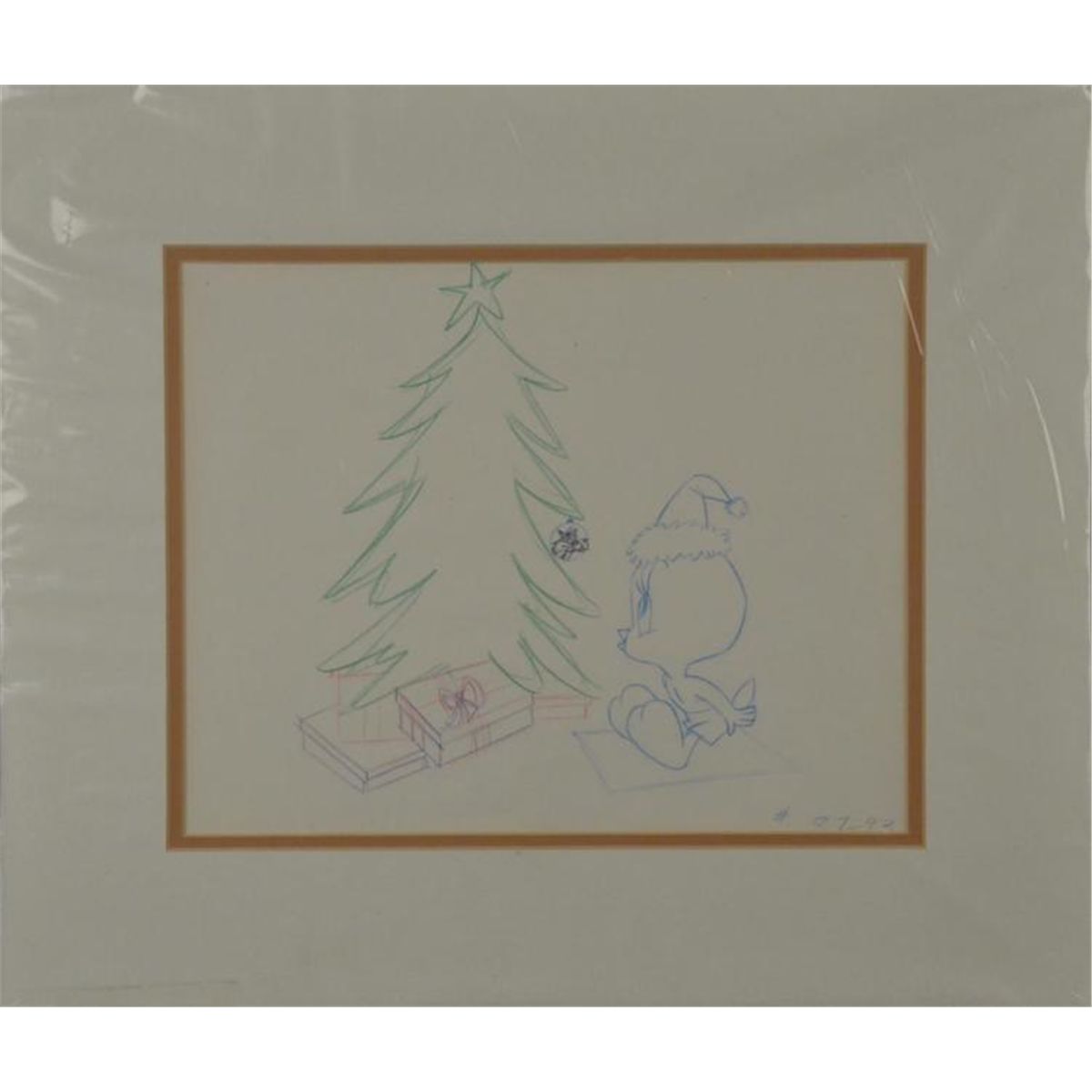 Tweety Bird is ready to celebrate Christmas in this delightful original production drawing used in the making of a cartoon. Look closely and you'll see who is reflected the shiny Christmas ornament! * Medium: Red, green and blue pencil on paper Animator notations, right edgeImage size: 9 1/2 x 12 inchesPresentation: Double matted in white and brown matte, ready for framingMatte size: 15 1/2 x 18 inchesCondition: Excellent