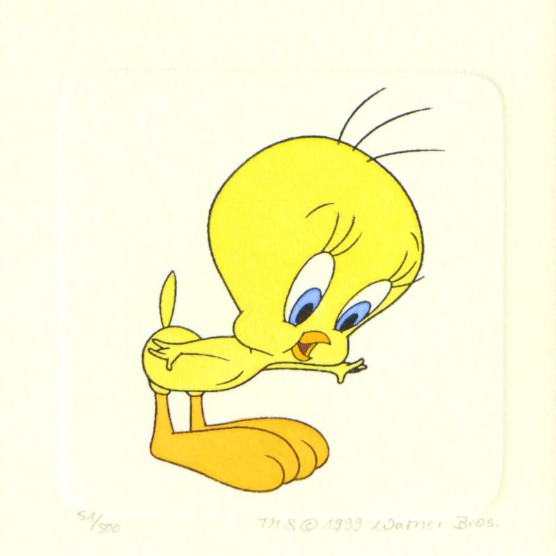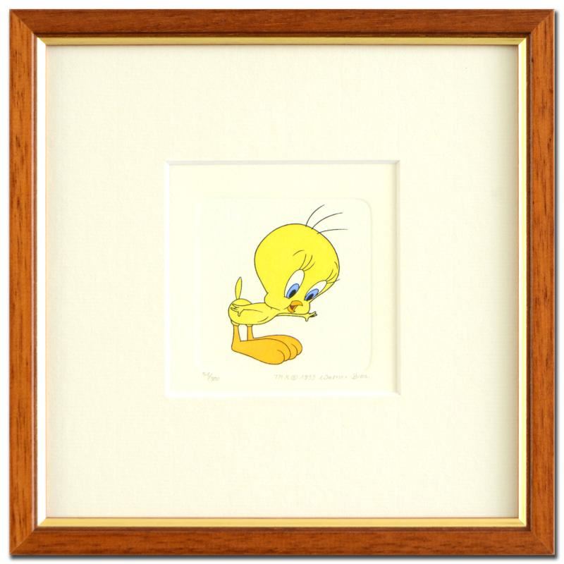 "Tweety" is a limited edition etching on paper with hand-tinted coloring from Warner Bros. (dated 1999) and numbered! This piece comes framed. Measures approx. 8.5" x 8.5" (with frame), 2" x 2.5" (image).