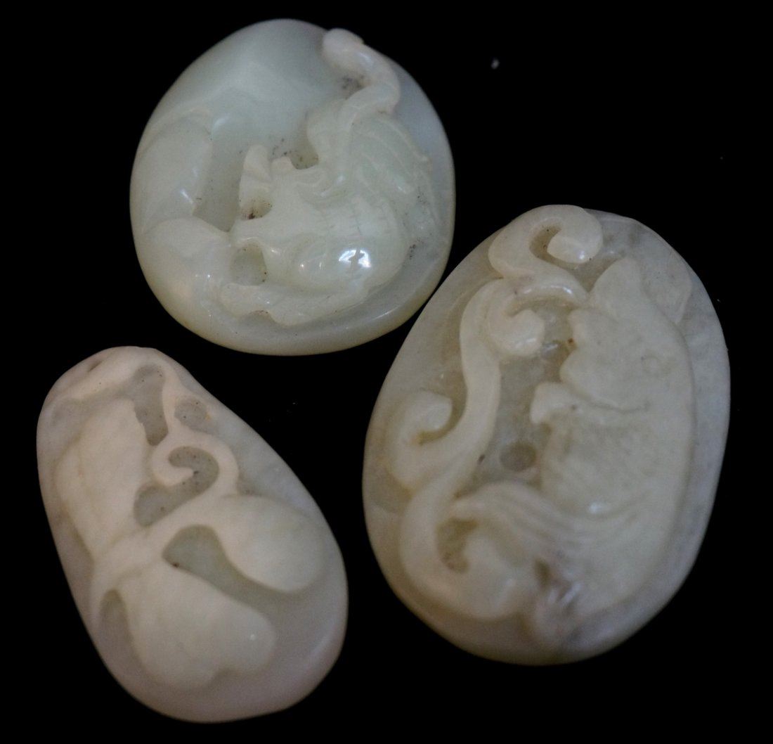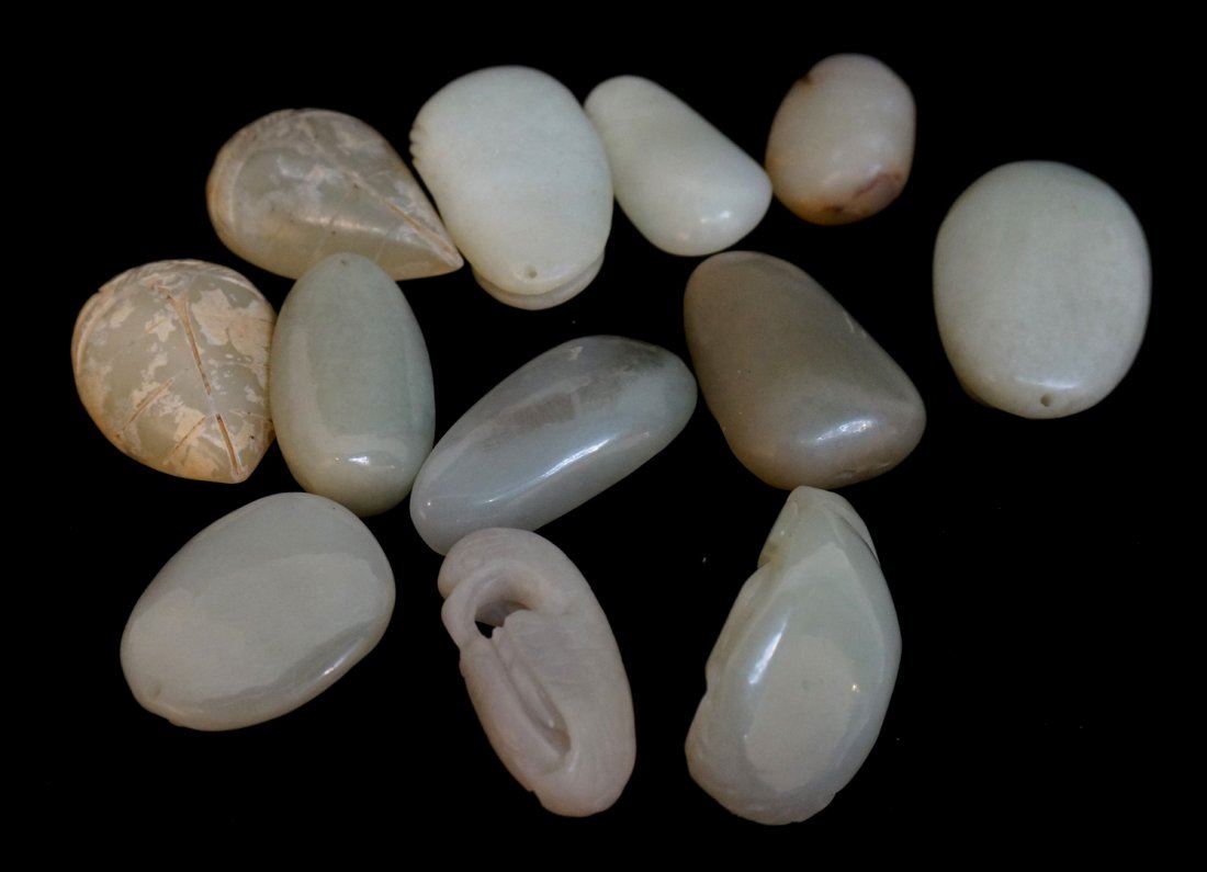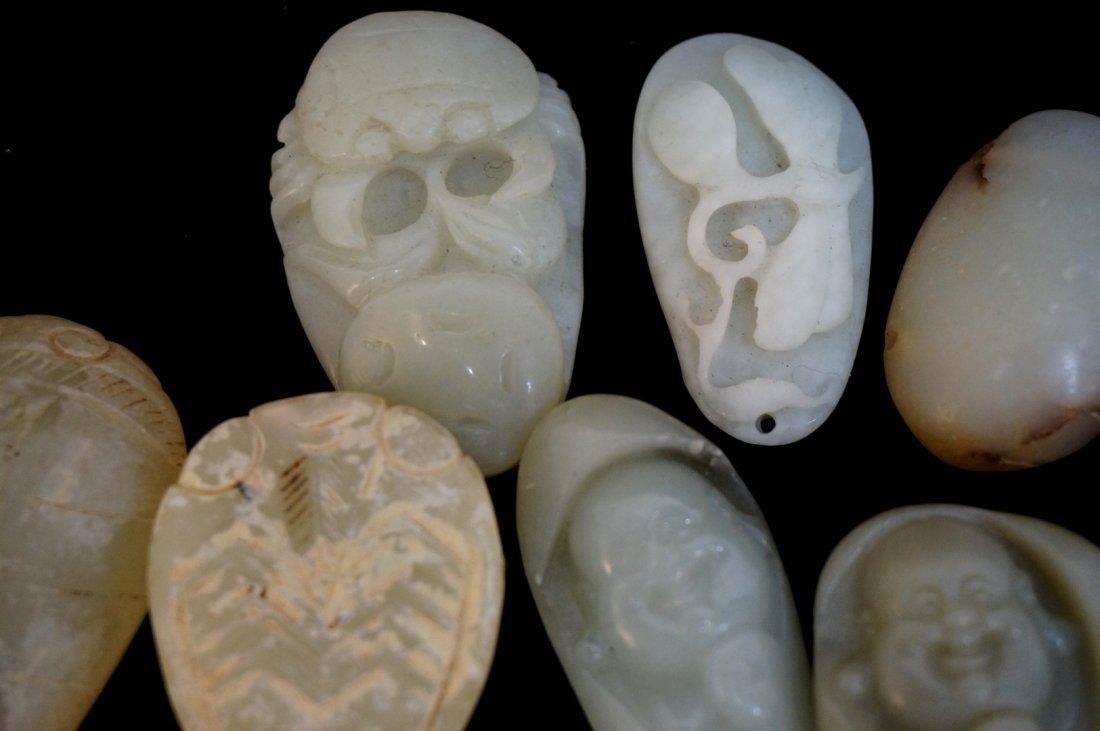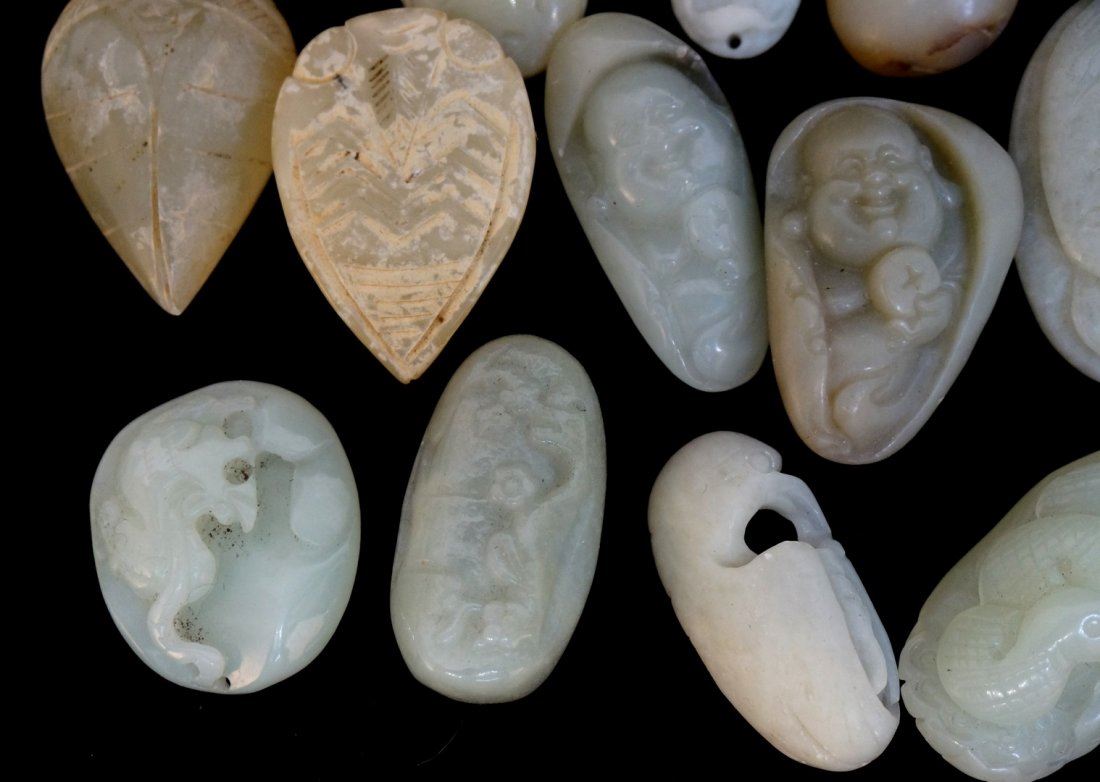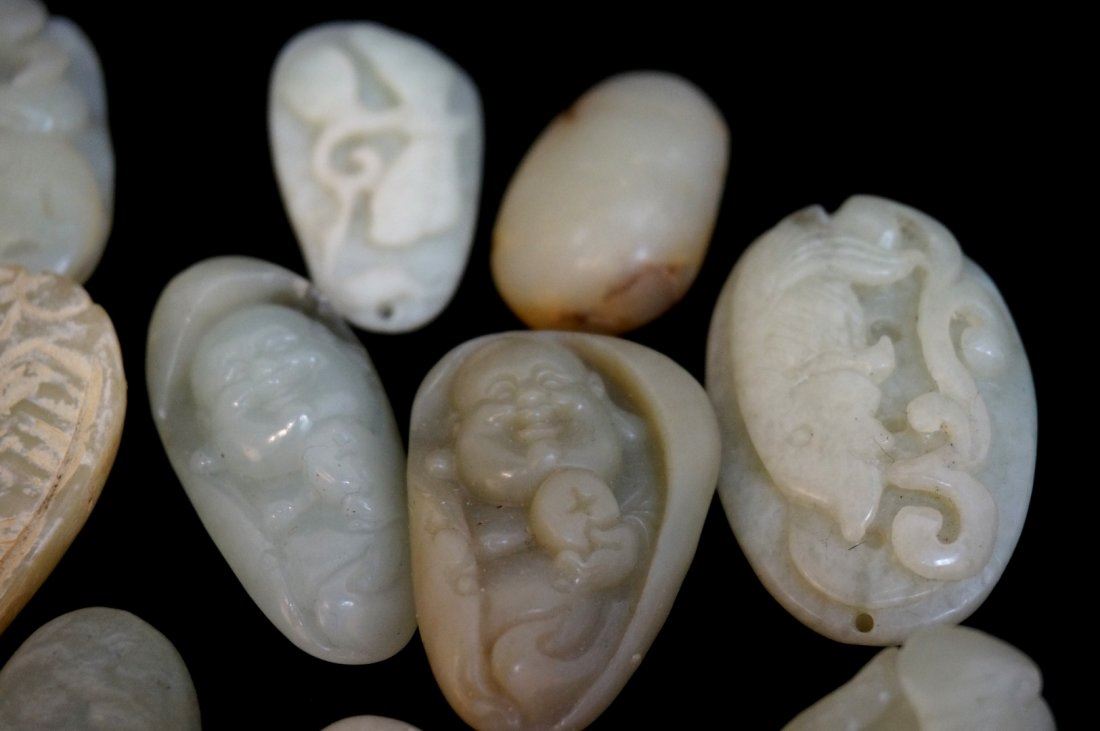 Twelve carved jade pendants of various sizes. Two happy Buddha pendants, a crab, fish, a pair of tear drop shaped sea creatures, etc. Only 20 lots in this sale have reserves, marked with "R" at end of description.