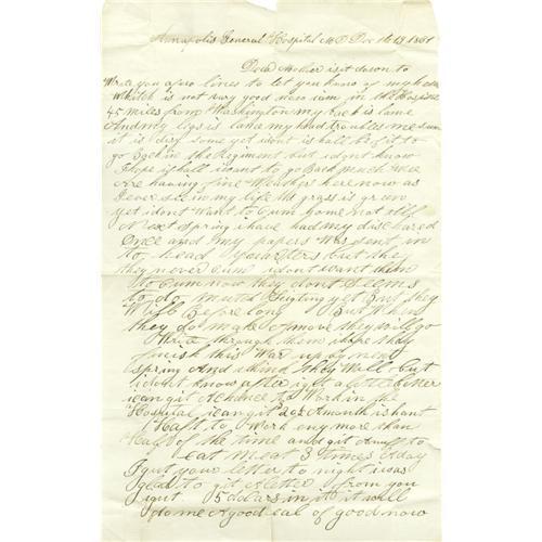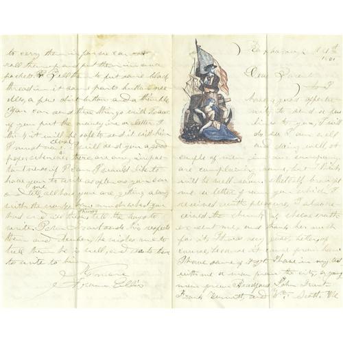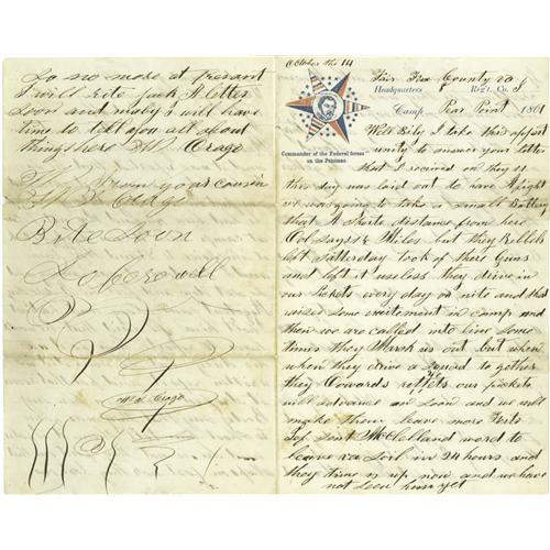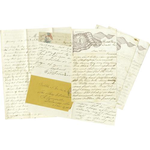 <B>Twelve Civil War Soldiers' Letters.</B></I> A diverse collection of Federal personal correspondence, approximately 40 pages, 8vo and 4to, mostly from Virginia locations, 1861-1864. Seven of the letters are on colorful patriotic stationery, one of which features George B. McCLellan's bust within a six-pointed star. Other themes illustrated are Columbia, a flag-waving sailor, and an American banner emblazoned with the Massachusetts Seal. Two of the letters - with covers - have exceptionally fine content as follows: W.H. Robinson of New York, writing from a "<I>Camp Near Fredericksburg</B></I>" on December 20, 1862, relates battle experience in part: "<I>…I suppose you have heard of the batle before this time the 89 took a part in it and lost some men we have one missing lost in the last charge after dark Saturday night…David Thomas hit on the belt plate…the 89 crosed in boats and took the city without losing a man after fighting all day to get the pontoon bridge acrost…</B></I>". Erwin Welsh of the 67th Ohio wrote from Chesterfield County, Virginia on July 7, 1864, "<I>…I think our present position is one of more injury to the Enemy than it would be to capture Richmond and let Lee Retreat into the Exterior with his army…the enemy have no communications south of Petersburg while General Custer has made another extensive raid which he cut the Richmond & Danville Railroad totally destroying the track for upwards of 30 miles, although there are nothing to hinder Lee from going to Washington But let him go that is just what Grant wants…</B></I>". All of the above is lightly aged as expected with mailing folds. Overall fine condition.<BR><BR><b>Shipping:</b> Small Flat (<a target="_blank" href="http://www.heritageauctions.com/common/shipping.php">view shipping information</a>)