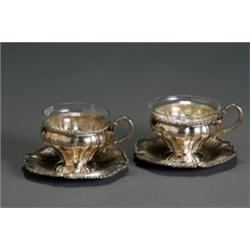 Each having a lobed body with scroll handle, raised on a shaped foot, with clear glass insert, above a complementary undertray. Each impressed 800, SB and with triangular mark.