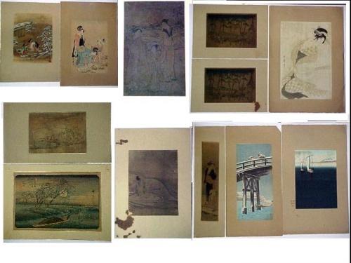Twelve Japanese wood block prints; eleven are signed or stamped; including two figures on boat by Yeishi (Hosada) 14 3/4" x 3 1/4"; (two of) figures in landscape by Hokusai 6 3/4" x 9 3/4"; three figures by Shunman 9 1/4" x 6"; three figures in landscape