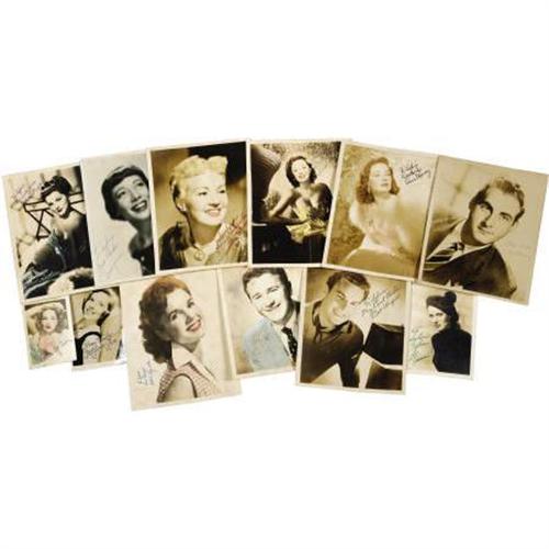 <B>Twelve Vintage Signed Hollywood Stars Photos.</B></I> Set of 12 signed b&w photos includes 8" x 10" shots of Sid Caesar, Robert Wagner, Debbie Reynolds, Debra Paget, Susan Hayward, Gene Tierney, Imogene Coca, and Betty Grable; a 3.5" x 5" of Ann Southern; a 4.25" x 6" of Betty Ann Grove; a 5" x 7" of Maureen O'Hara; and a 7" x 9" of Red Buttons. Most have been hand-tinted and are in overall Fine condition with mild to moderate wear and toning.<BR><BR><b>Shipping:</b> Flat Material, Small (<a target="_blank" href="http://www.heritageauctions.com/common/shipping.php">view shipping information</a>)