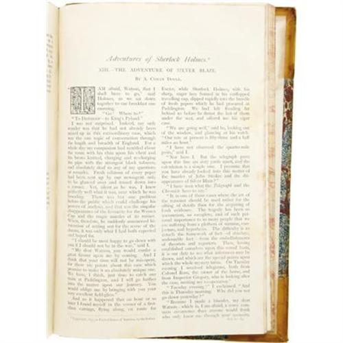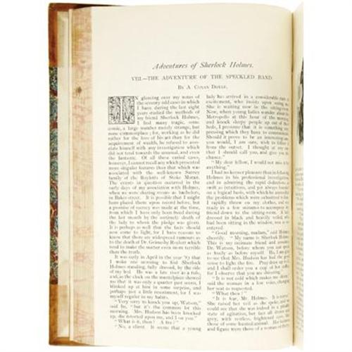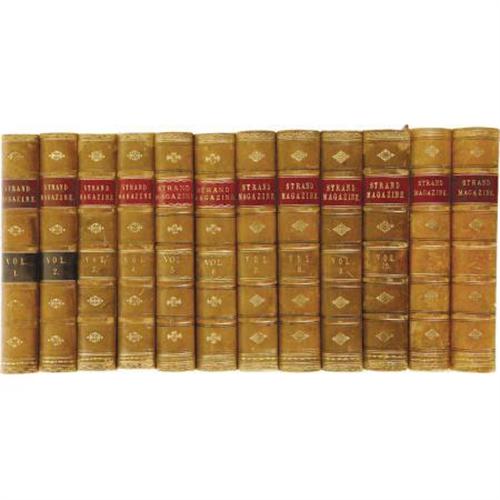 <B>Twelve Volume Set of <I>The Strand Magazine</B></I></B></I> <B>Originals Containing the First 24 Sherlock Holmes Stories</B></I> (London: George Newnes, Ltd., 1891-1896), various paginations, beautiful half leather bindings with marbled boards and gilt spine titles, 8vo (6.5" x 9.5"). Marbled endpapers and edges. A long and fruitful marriage began between <I>The Strand</B></I> and Sherlock Holmes with the publication of "A Scandal in Bohemia" in the July 1891 issue of the magazine. Two longer works, <I>A Study in Scarlet</B></I> and <I>The Sign of the Four</B></I> had been published previously, but the popularity of Sherlock Holmes rocketed to the moon in <I>The Strand.</B></I> The stories in the collection presented here include the aforementioned "A Scandal in Bohemia", "The Adventure of a Speckled Band", "The Adventure of the Engineer's Thumb", "The Adventure of the Copper Beeches", "Silver Blaze", "The Crooked Man", "The Final Problem", and 17 more, just as they appeared to the Victorian reading public in London. These stories were later collected into the first two Sherlock Holmes collections, <I>The Adventures of Sherlock Holmes</B></I> and <I>The Memoirs of Sherlock Holmes.</B></I> The volumes have moderate shelf wear, but are overall in very good or better condition. An amazing and handsome set of original <I>Strand</B></I> Sherlock Holmes.<BR><BR><b>Shipping:</b> Books & Catalogs (<a target="_blank" href="http://www.heritageauctions.com/common/shipping.php">view shipping information</a>)
