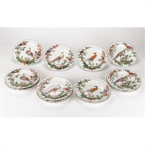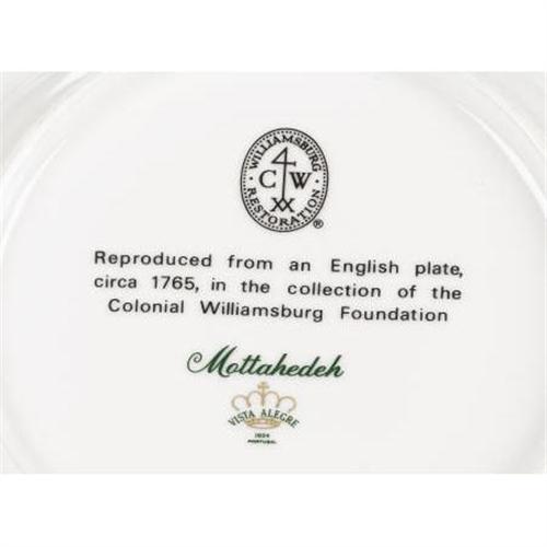 <B>Twelve Decorative Plates</B></I> <BR>Three each of four different designs of long-tailed birds<BR>8-1/4 inches diameter Stamped on the bottom is "Reproduced from an English plate, circa 1765, in the collection of the Colonial Williamsburg Foundation." The name "Mottanhedeh" is on the bottom as well as "Vista Alegre, 1824, Portugal", probably indicating the manufacturer.<BR><BR><b>Shipping:</b> Requires 3rd Party Shipping (<a target="_blank" href="http://www.heritageauctions.com/common/shipping.php">view shipping information</a>)