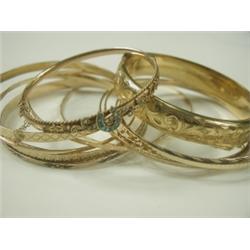Twelve various bangles, including a 9ct Victorian hinged bangle set with turquoise and seed pe...