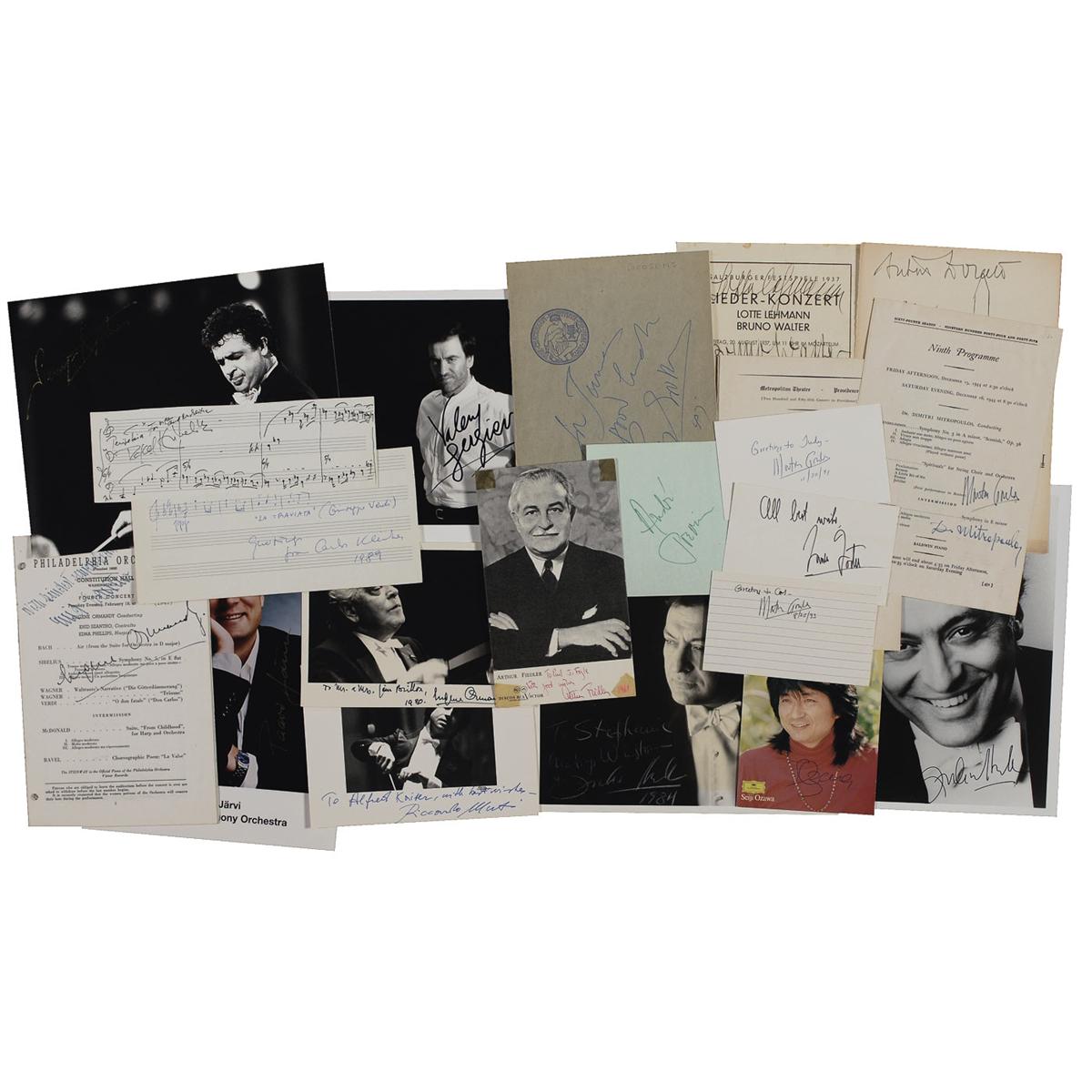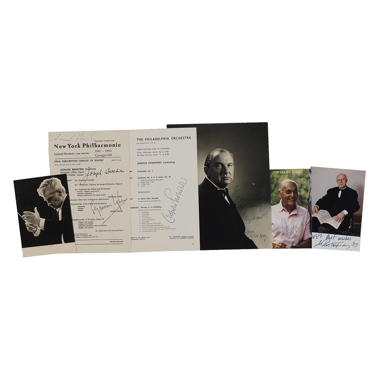 Collection of 30 items signed by many of the leading 20th century conductors consisting primarily of signed photos of various sizes, concert programs, and AMQSs. Photos are signed by Seymon Bychkov, Arthur Fiedler, Valery Gergiev, Paavo Jarvi, Herbert von Karajan, Zubin Mehta (2), Ricardo Muti, Eugene Ormandy, Seiji Ozawa, Fritz Reiner, Mstislav Rostropovich, and Sir George Solti. Concert programs are signed by: Leonard Bernstein (also signed by Joseph Fuchs and Seymour Lipkin), Antal Dorati, Eugene Goossens, Serge Koussevitsky, Dimitri Mitropoulos (also signed by Morton Gould), Eugene Ormandy (also signed by Enid Szantho), Leopold Stokowski, and Bruno Walter (also signed by Lotte Lehman). Musical quotes are from Carlos Kleiber (La Traviata), Rafael Kubelik (Symphonic Peripeteia), and Erich Leinsdorf (Ode To Joy). Other items include signatures of Walter Damrosch, Lawrence Foster, Morton Gould (2), Andre Previn, and Felix Weingartner. In fine overall condition.