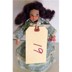 Pliable plastic doll that is approximately 9 1/2 inches . She is has long brown hair and has blue eyes. She is dressed in a period long blue dress. She has her own stand and is in good condition.