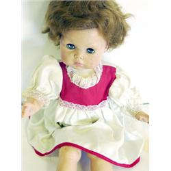 This 20th century doll is made of pliable plastic. She is soft and cuddly. She has an "Amer. Char Doll" marking on the back of her neck. She is approximately 18 inches. She has short blond hair, blue sleeping eyes and cries when she is squeezed. She is wearing a white dress trimmed in red with the letters ABC sewed on the front of her skirt. Her features are "darling". She is in good condition.