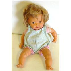 This 20th century doll is made of durable plastic with a very soft body. She has a 1991 Mattel, Inc. marking on the back of her neck. She is approximately 15 inches. She has short blond hair and fixed brown eyes. She is wearing a short blue print jumper trimmed in pink. She has an adorable face and is in good condition.