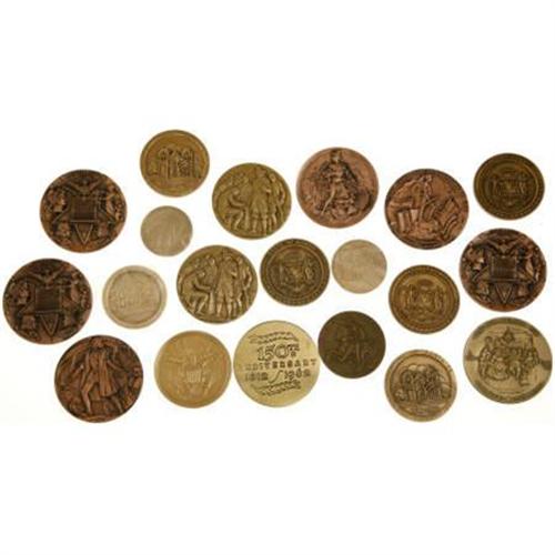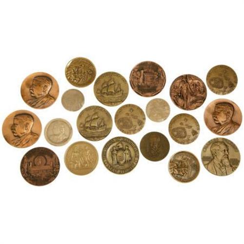 <B>Twenty Assorted Bronze Medals Depicting A Variety of Subjects.</B></I> Modern restrikes of original medals. Ranging in size between 48mm and 75mm, the twenty medals presented here honor a wide range of people and events. Three medals commemorate Theodore Roosevelt, three celebrate Hawaii's entry as the 50th state in the American Union, two medals immortalize the Mayflower voyage, and one medal honors Christopher Columbus on the obverse and Saint-Gaudens on the reverse. Additionally, there are two medals depicting literary greats: one Charles Dickens and one Miguel Cervantes. Overall, the medals in this lot are extremely fine.<BR><BR><b>Shipping:</b> Miscellaneous Collectibles, Larg (<a target="_blank" href="http://www.heritageauctions.com/common/shipping.php">view shipping information</a>)
