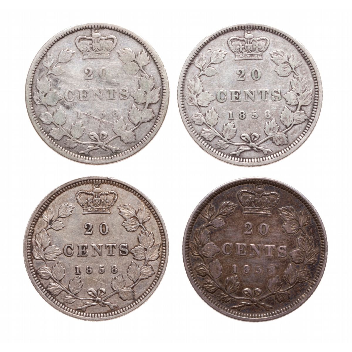 Twenty Cents. 1858. Good-6; VG-8; Fine-12; Very Fine-30. Coinage alignment. Lot of four (4) coins.
