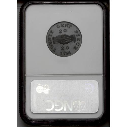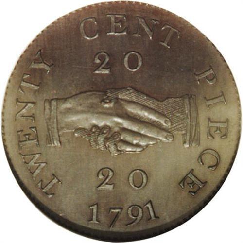 <B>Twenty Cents bronzed Proof 1791, </B></I>KM4a, PF64 BN NGC. Long die-break and some faint die-rust spots, indicative of a later strike. The designs seem to fit ever so well on this size planchet, a curious denomination for the era. Very choice and desirable.