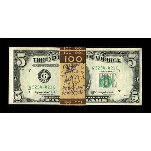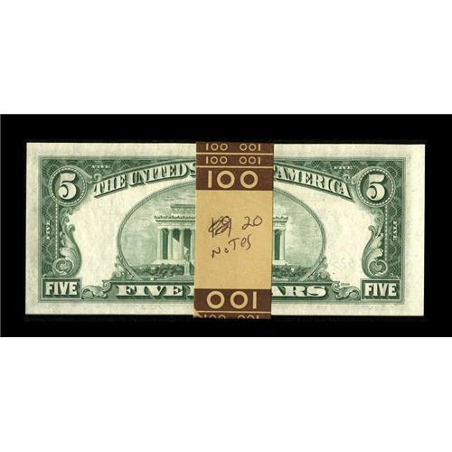<B>Twenty Consecutive Fr. 1964-G $5 1950C Federal Reserve Notes. Choice Crisp Uncirculated.</B></I><BR>This pleasing group is bound by a strap indicating the face value of $100. The notes are crisp with margins ranging from Choice to Gem in quality.<BR><BR><b>Shipping:</b> Coins & Currency (<a target="_blank" href="http://www.heritageauctions.com/common/shipping.php">view shipping information</a>)