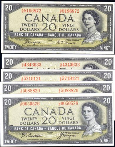 Bank of Canada 1954 Twenty Dollars, Devil’s Face, Coyne-Towers, BC-33a Serial Number A/E8196872, VF. Plus Twenty Dollars, Modified Portrait, Beattie-Coyne, BC-41a, four notes, all EF. Total of five notes