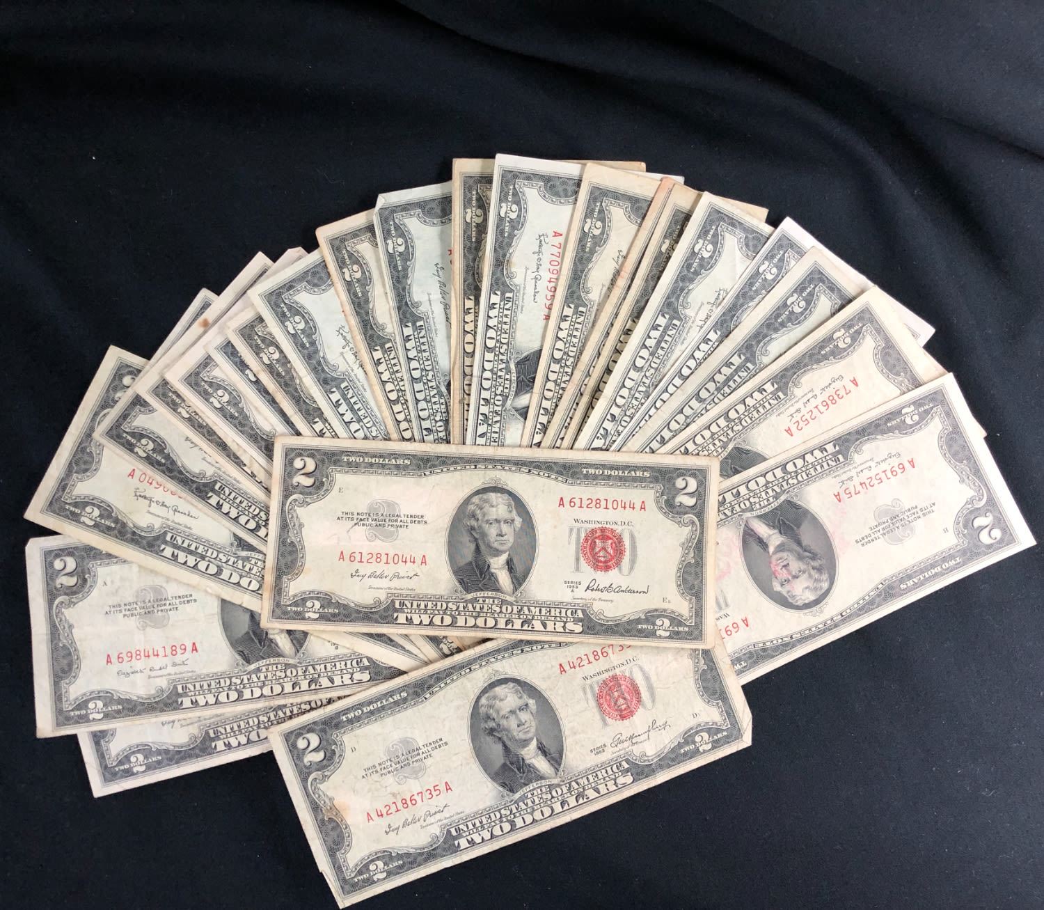 A lot of Twenty-Five (25CT) 1953-1963 USN $2 Red Seals in Average Circulated condition. All nice problem free notes, great for resale or just to collect.& nbsp;& nbsp;