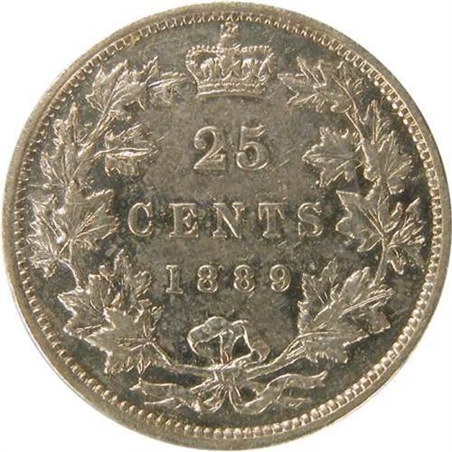 Canada Twenty-Five Cents 1889 ICCS VF-30. This is a sharp piece with considerable remaining lustre in the protected areas and an attractive pale golden toning