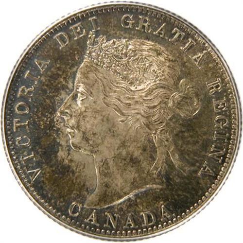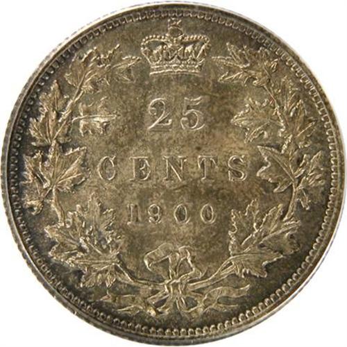 Canada Twenty-Five Cents 1900 PCGS MS-65. This is a fully struck piece with great lustre and near flawless surfaces that are attractively toned in light golden olives with light-medium blues and russets toward the rims. It is tied with two other examples as the second highest graded by PCGS