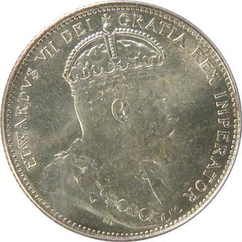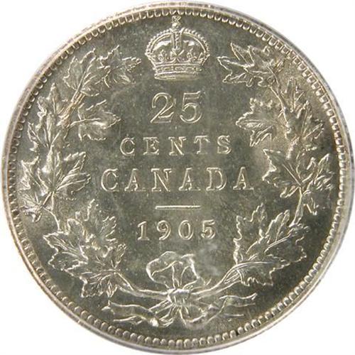 Canada Twenty-Five Cents 1905 PCGS MS-66. This is a fully struck and superbly lustrous piece with virtually flawless and near untoned surfaces. It is tied with one other example as the highest graded by the major services