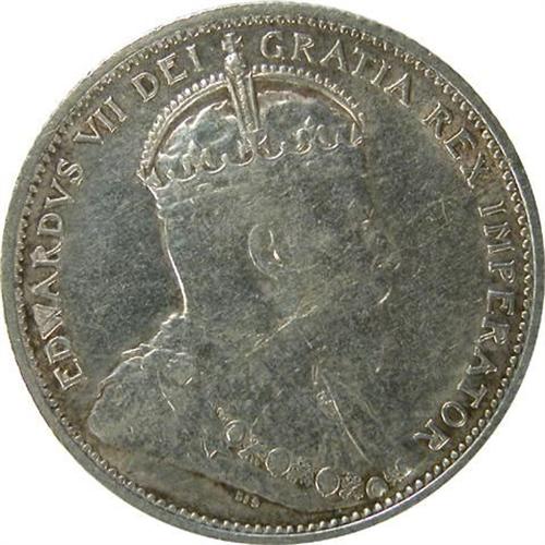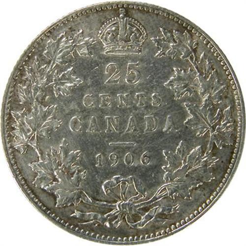 Canada Twenty-Five Cents 1906 Large Crown, EF cleaned, planchet flaw. There is a lamination on Edward’s face