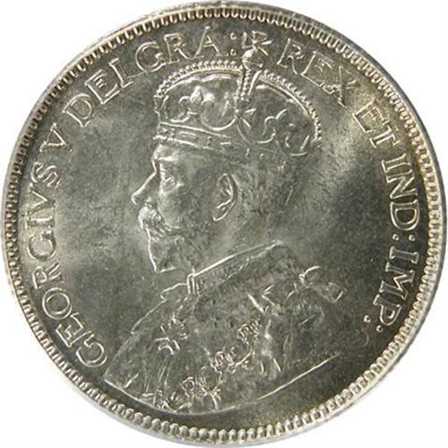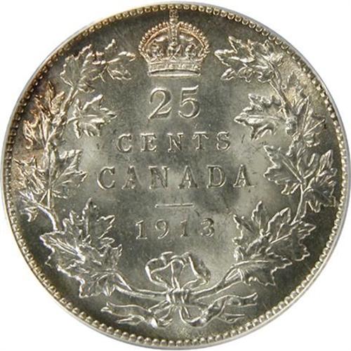 Canada Twenty-Five Cents 1913 PCGS MS-64. This is a fully struck and strongly lustrous piece with rather flawless pale golden toned surfaces with light amber rim accents