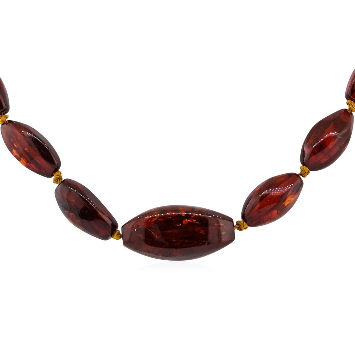One necklace measuring approximately twenty four inches in length featuring: oval shaped cherry colored Baltic amber beads measuring from 14mm to 8mm in diameter, with a total weight of 26.7 grams.
