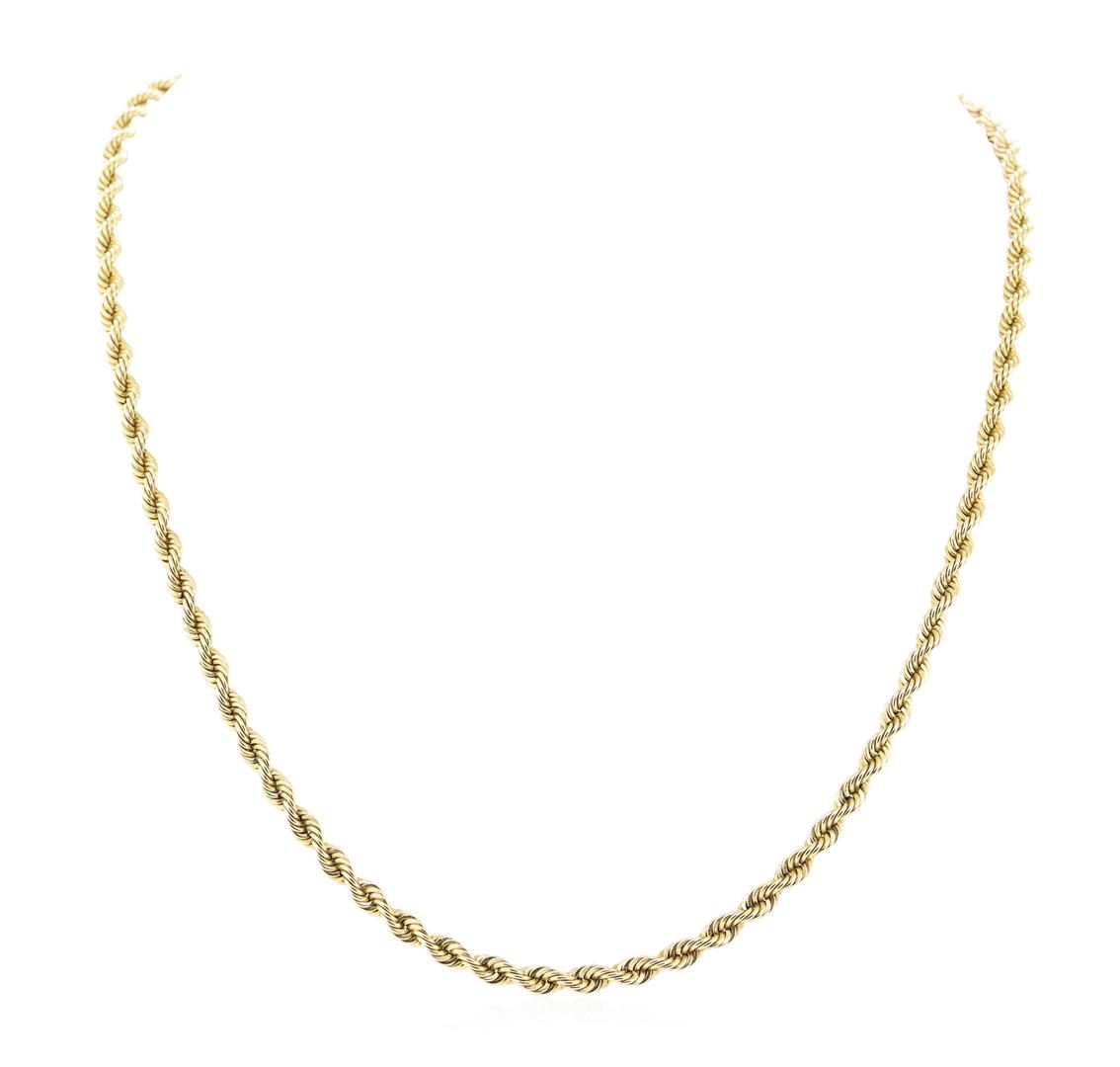 One rope chain measuring approximately twenty four inches in length featuring: 14KT yellow gold weighing 47.5 grams.