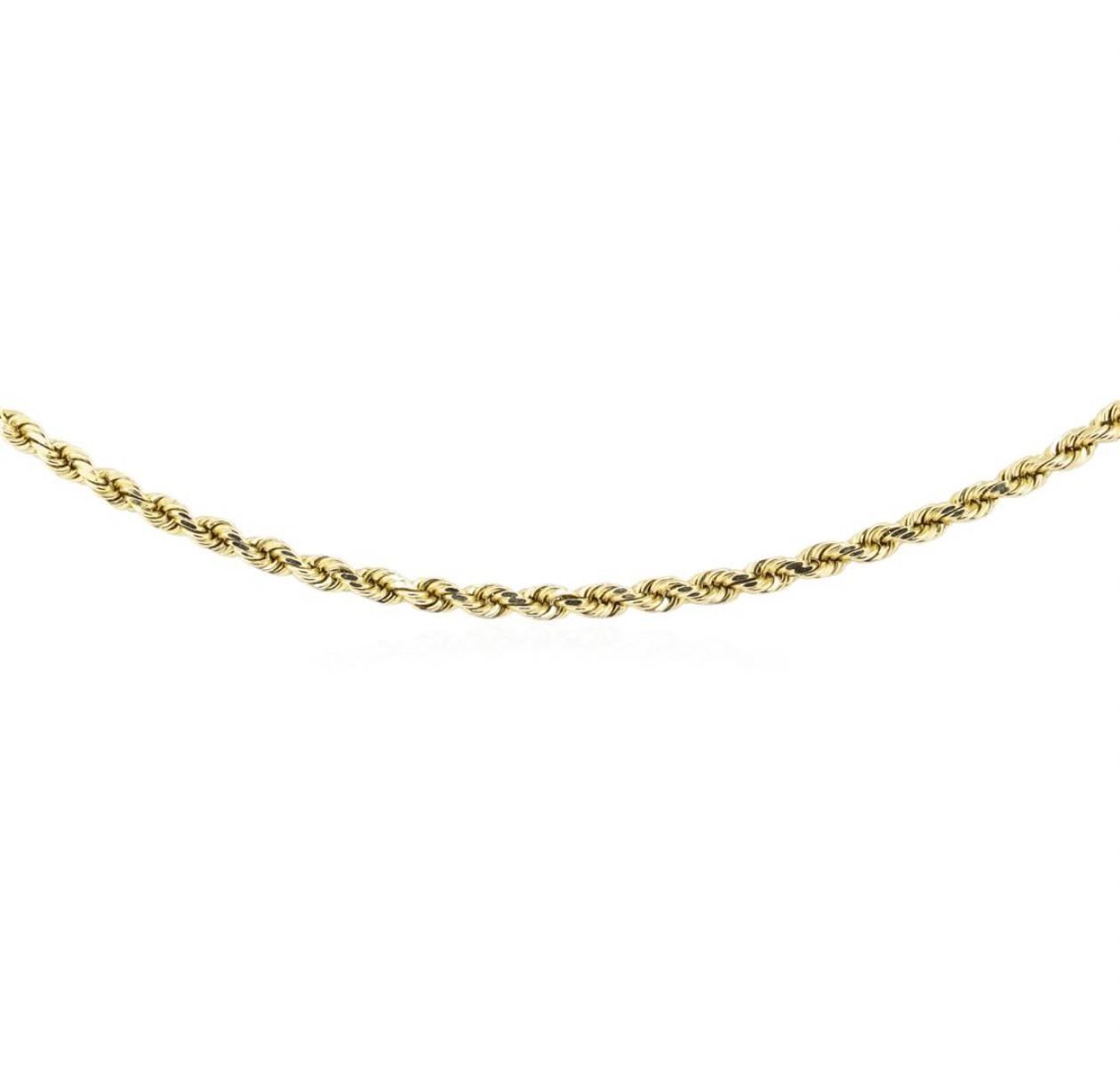 One 2.1mm wide rope chain measuring 20 inches long featuring: 14KT yellow gold weighing 9.8 grams.
