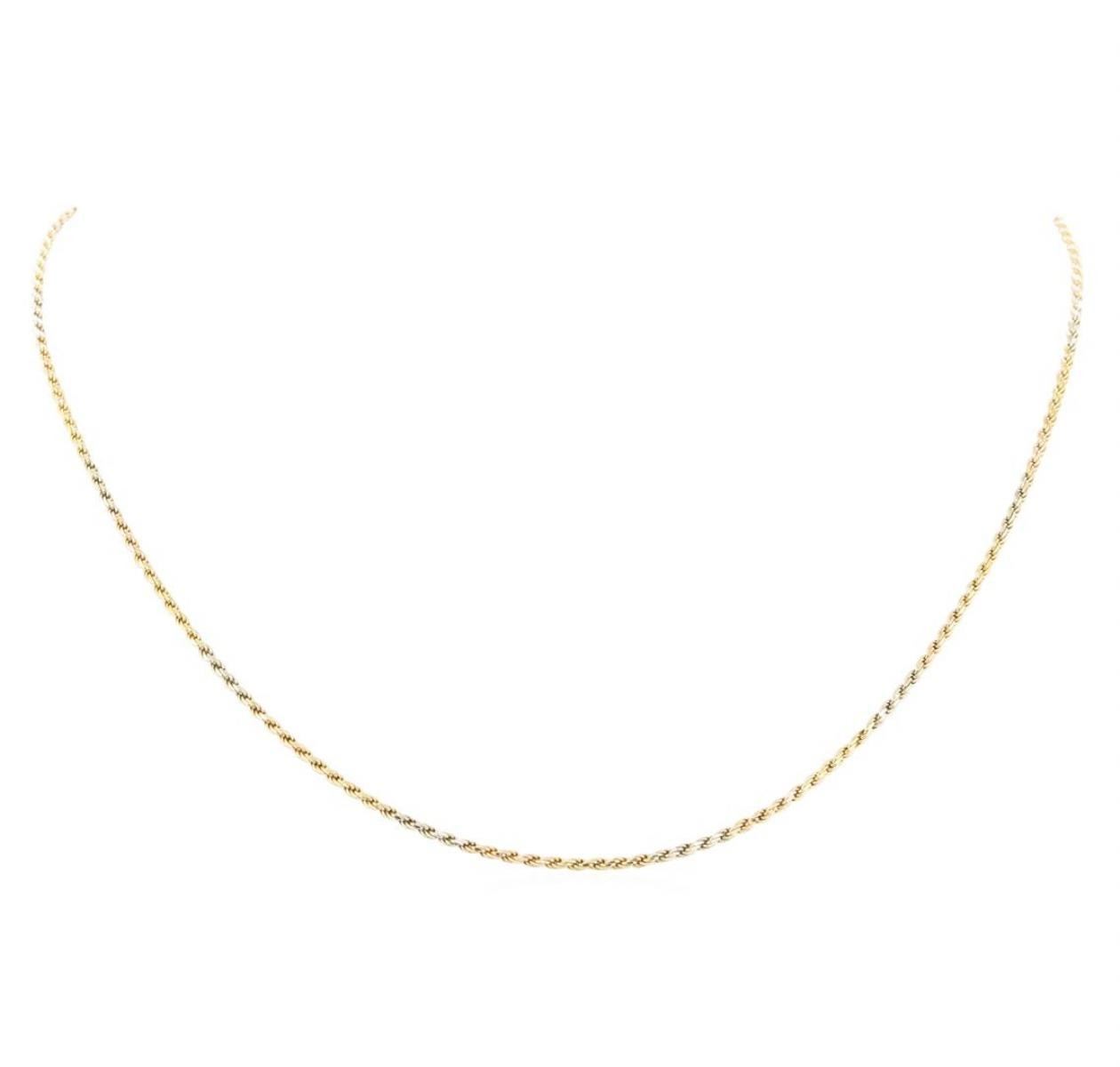 One 1.8mm wide diamond cut rope link chain measuring approximately 20 inches featuring: 14KT yellow, rose, and white gold weighing 7.3 grams.