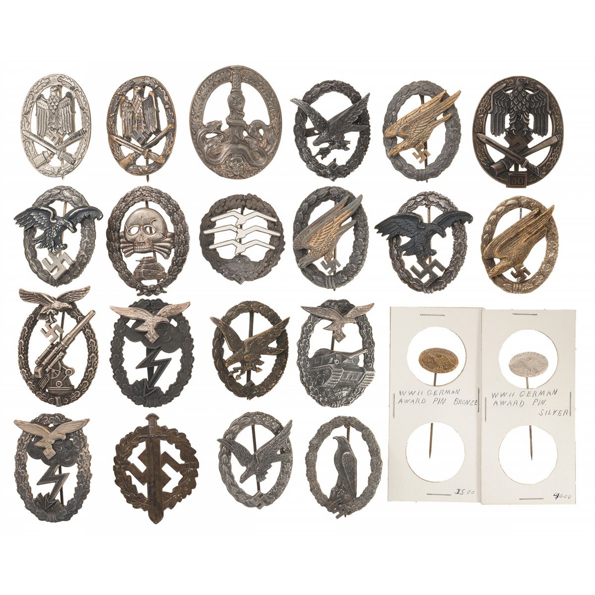 20 badges total, including Luftwaffe Paratrooper, Ground Assault, Panzer, Retired Pilot, Flak, and Radio Operator Badges, an Anti-Partisan Badge, Spanish Civil War Panzer Badge, and General Assault Badges. With two German Life-Saving Organization Pins, one "GRUNDSCHEIN" in bronze and a "EISTUNGSSCHEIN" in silver. Very good overall, some reproductions.