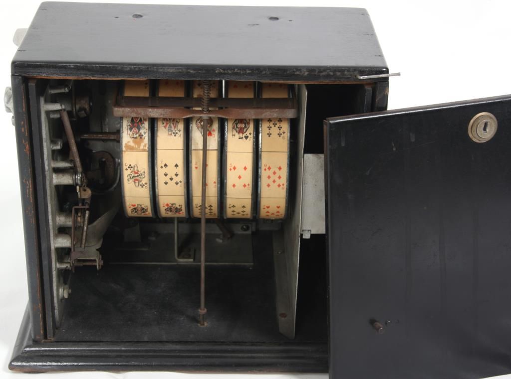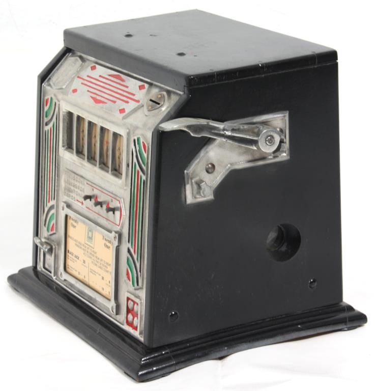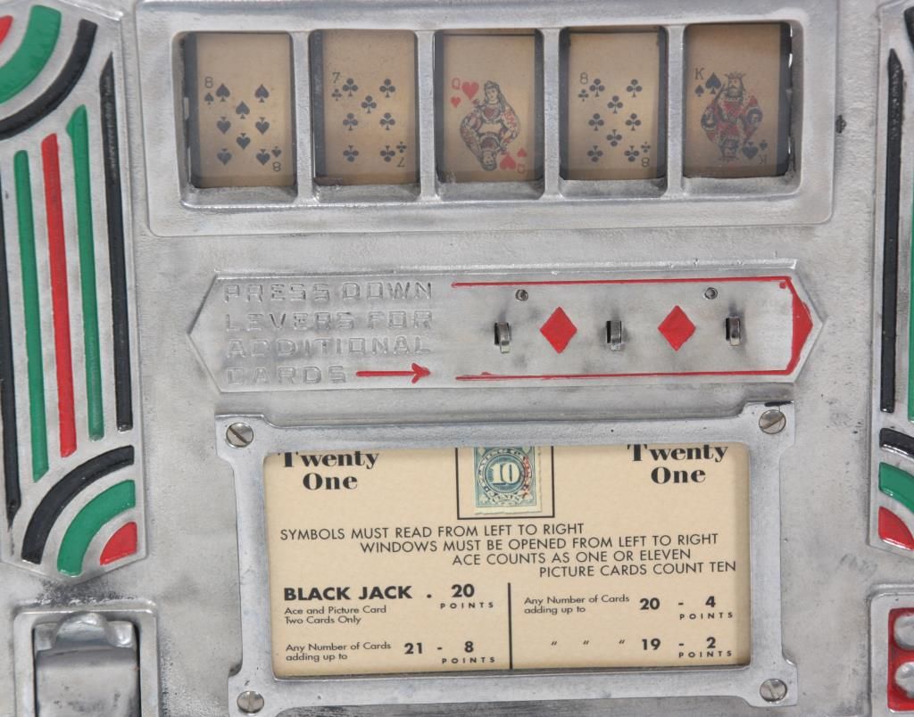 Twenty-One 5 Reel Trade Stimulator. 5 cent coin operated reel type trade stimulator by Groetchen Tool & Mfg. Co.; case has black painted wood sides, top and base, cast metal front with painted highlights. Insert the coin and pull the lever, the reels spin with curtains hiding 3 cards and 2 cards show to reveal your hand, with the levers below you can choose to draw additional cards. Dispenses a gum ball with each play, the game is 21 (black jack). Has back plate. 12.25 in. high x 14 in. wide x 11 in. deep.