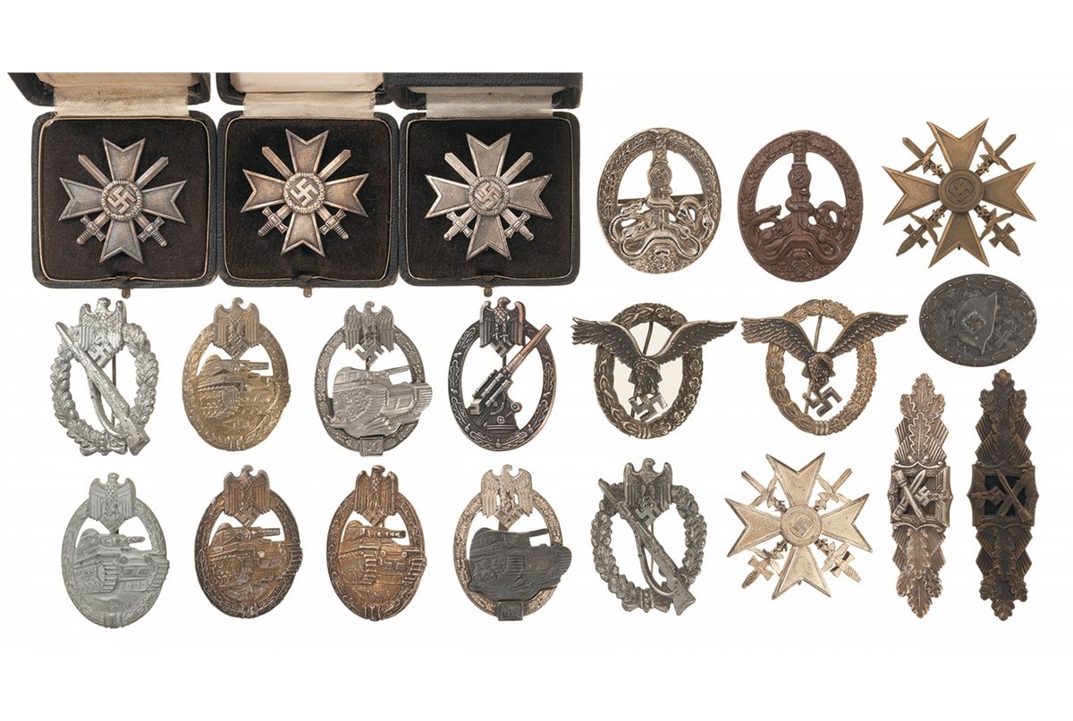 Grouping includes 2 Spanish Crosses (silver and bronze, both with swords), 2 Anti-Partisan Badges (bronze, silver), 5 Panzer Badges, 2 Close Combat Clasps, 1 Black Wound Badge, and 3 War Merit Crosses, 1st Class, with Swords, in presentation boxes. Very good overall. May contain reproductions.