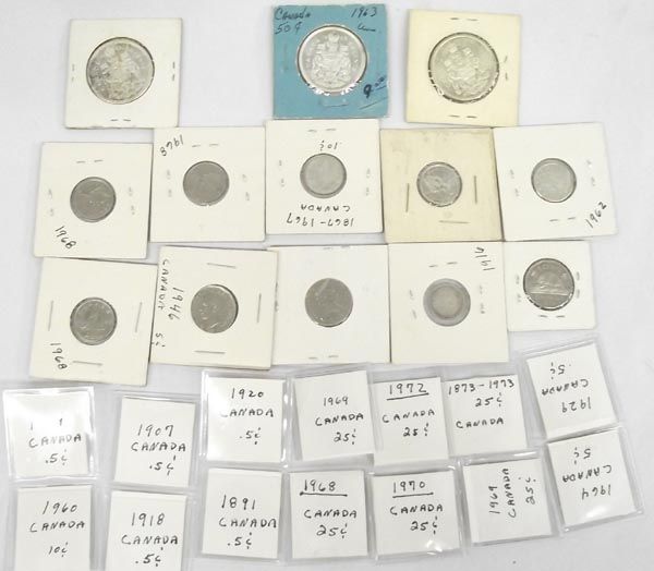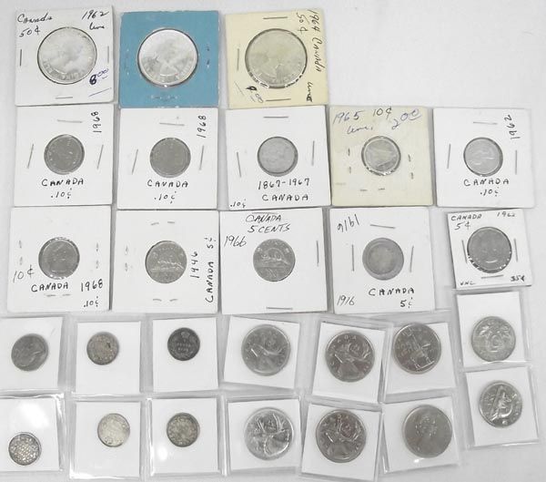 Twenty-Seven Canadian Coins. Three 50 cent coins, Six 25 cent coins, 6 10 cent coins and 12 5 cent coins.
