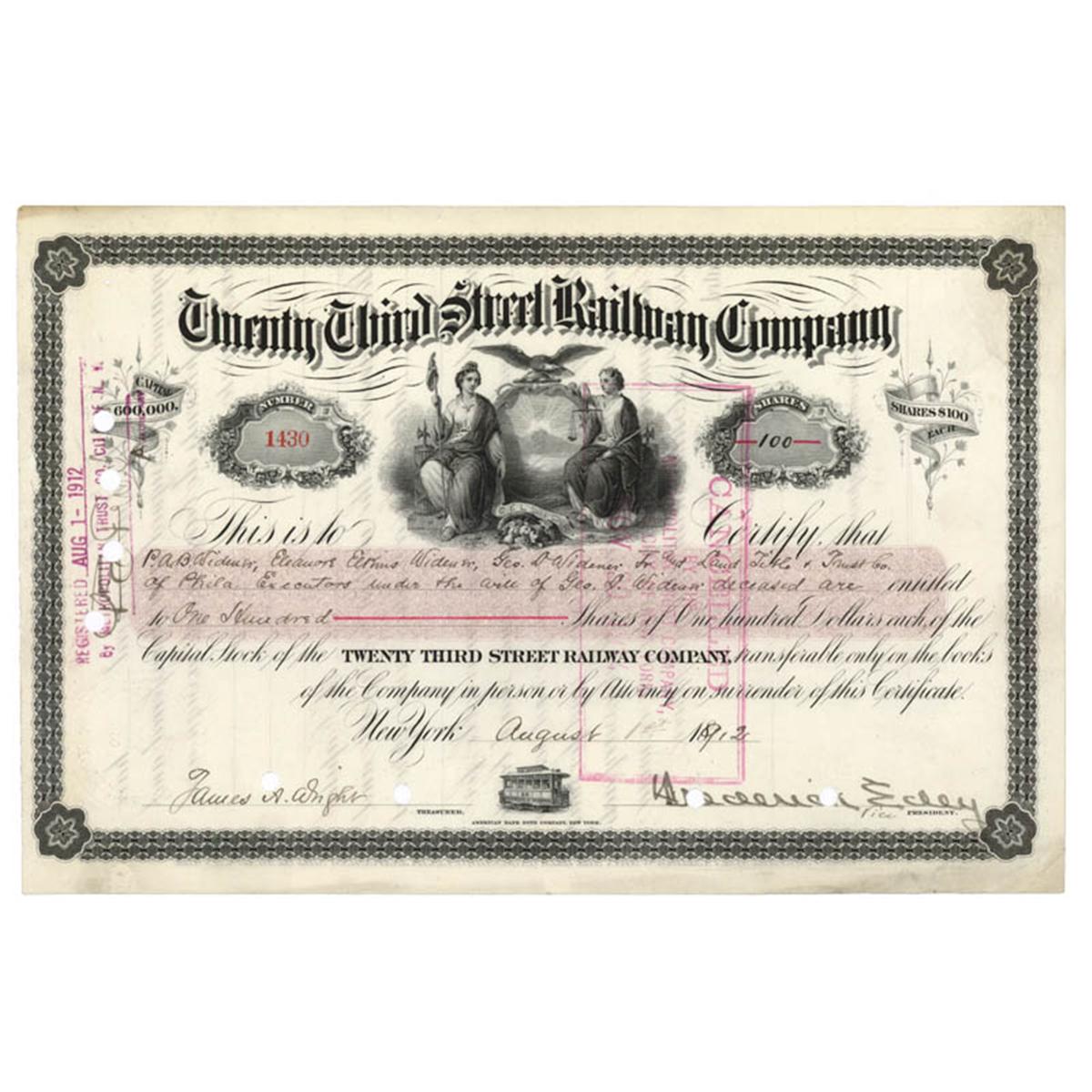 1912, New York. Stock certificate for one hundred shares issued to “P.A. B. Widener, Eleanor Elkins Widener, Geo. D. Widener, Fr [?]. And Land Title & Trust Co. of Phila, Executors under the will of Geo. D. Widener deceased” Black / White. Vignette of a stylized New York State Seal at top center. Smaller vignette of a street car at bottom center. Punch and stamp cancelled. Overall Extremely Fine.