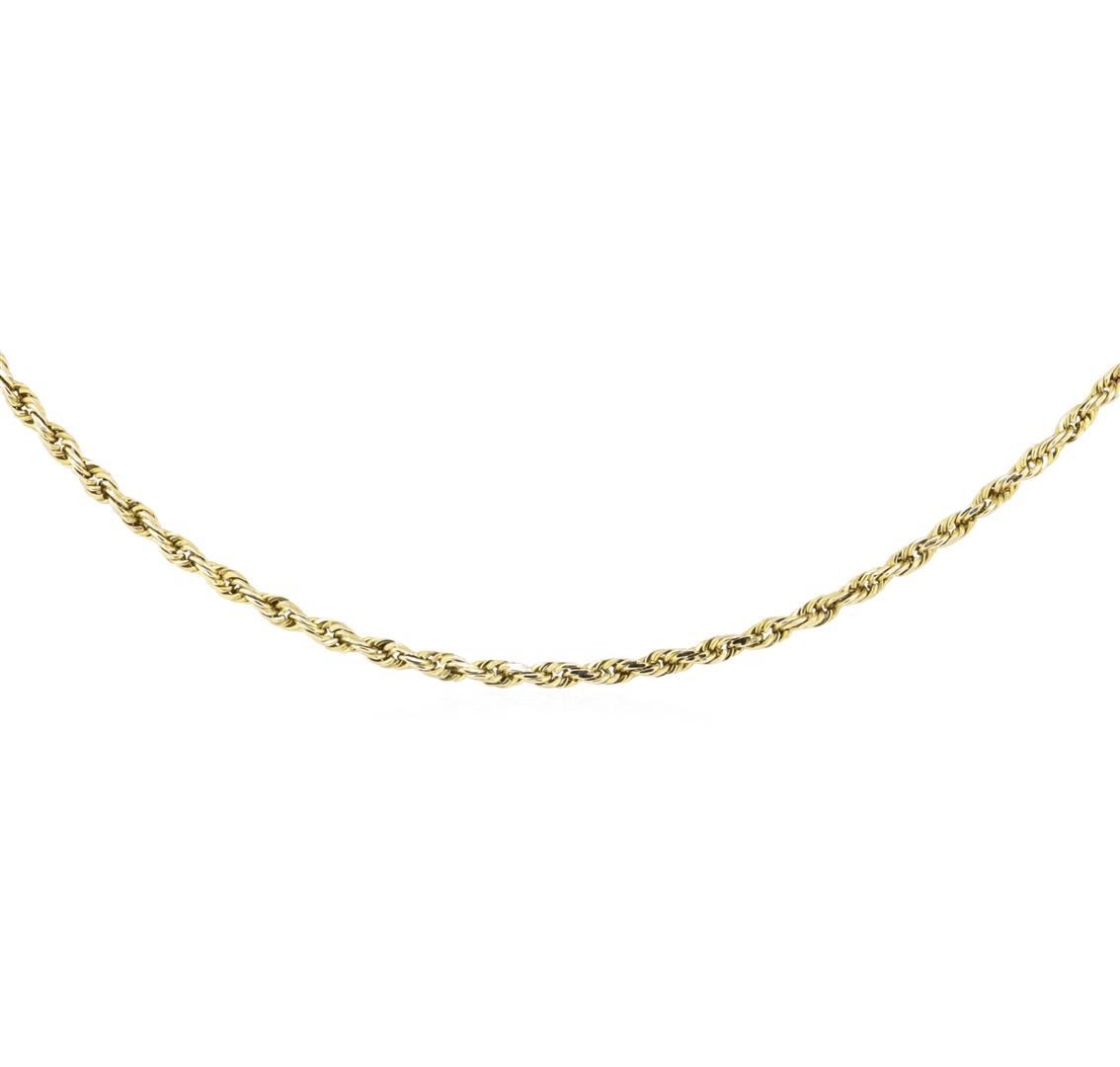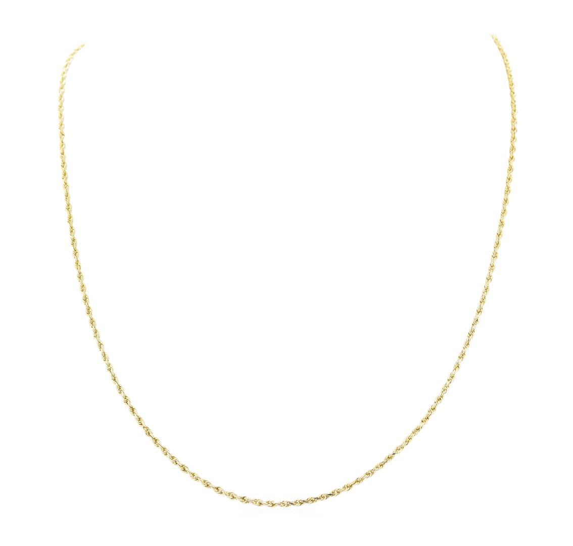 One 2mm wide diamond cut rope link chain measuring approximately 23 inches featuring: 14KT yellow gold weighing 6.6 grams.
