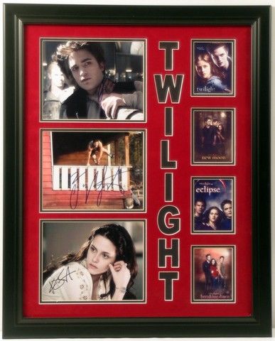 A grand shimmering collectable for "Twilight" fans. A massive professionally framed collection of Twilight memorabilia. First are three mounted and matted color production personally signed photos of Edward Cullen (Robert Pattinson), Jacob Black (Taylor Lautner), and Bella Swan (Kristen Stewart), then a beautifully three-color mounted "TWILIGHT" lettering which borders a four-color mounted series of lobby title cards of the full saga: "Twilight", "New Moon", "Eclipse", and "Breaking Dawn". All on a background of true rich blood red backing. The autographed photos are 10"x7" and the title cards are 4.5"x6". The fully framed impressive display is a large 26"x32".
