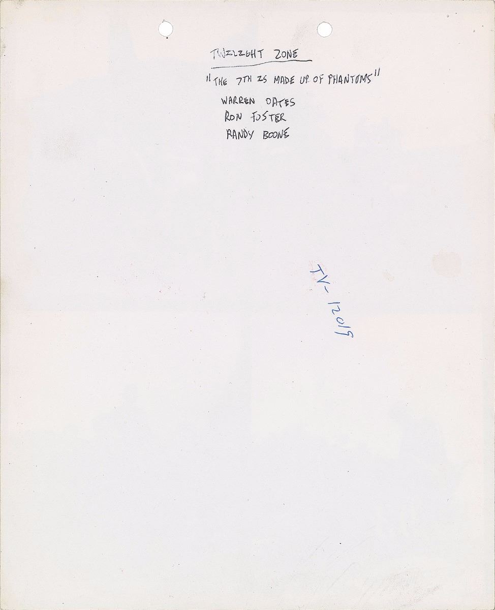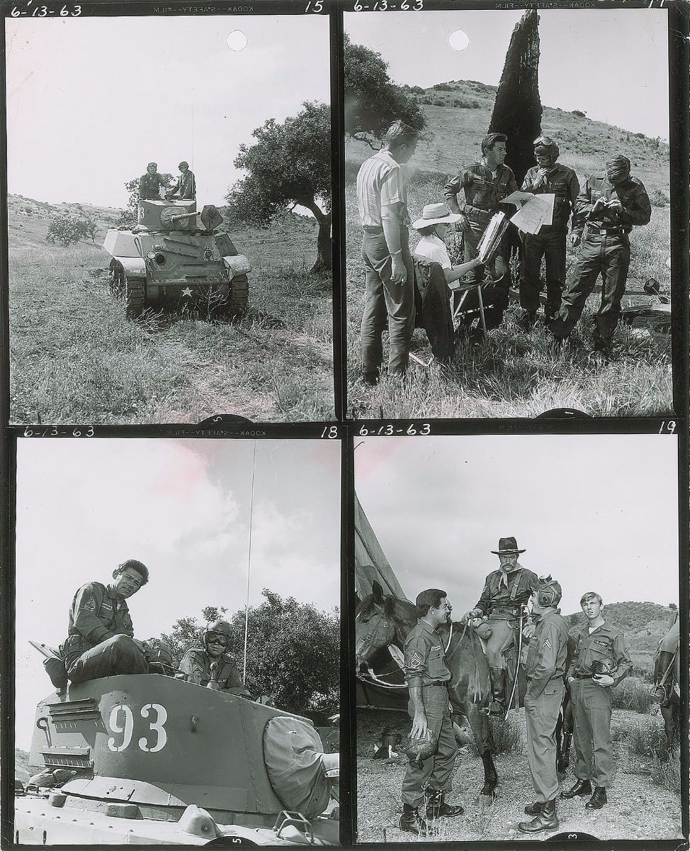 Original glossy photographic contact sheet, 8 x 10, featuring four sharp images from the production of the fifth season episode “The 7th Is Made Up of Phantoms,” starring Warren Oates, Ron Foster, Randy Boone, and Greg Morris, dated June 13, 1963. Images show the actors with tanks, on horseback, and reviewing their scripts. In fine condition, with two punch holes at top.
