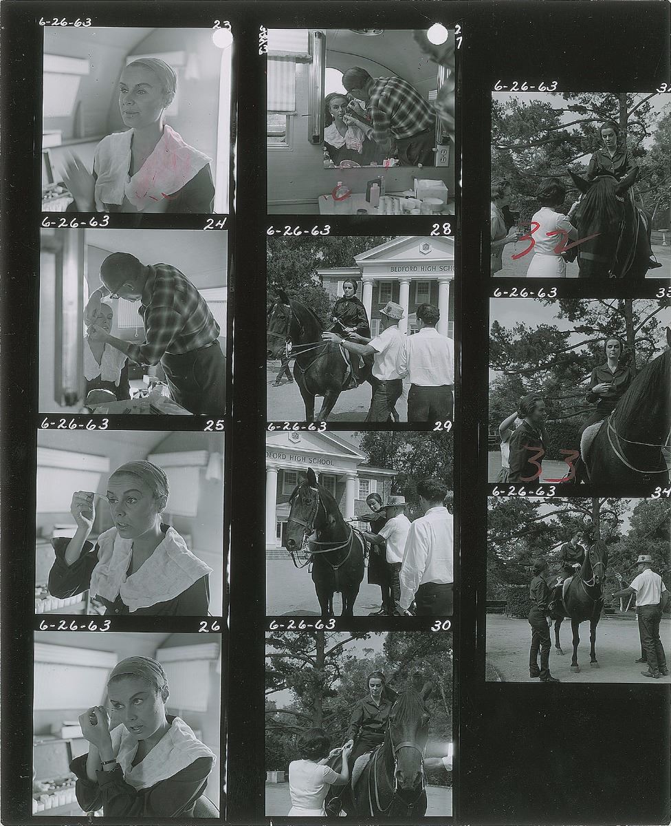 Original glossy photographic contact sheet, 8 x 10, featuring eleven crystal-clear images from the production of the fifth season episode “Spur of the Moment,” starring Diana Hyland and Robert J. Hogan, dated June 26, 1963. Images show the actress during make-up application in the trailer and on horseback. In fine condition, with two punch holes at top and red wax markings to some images.