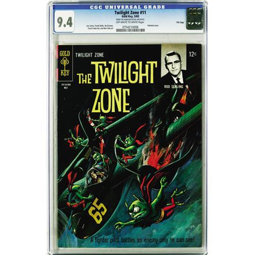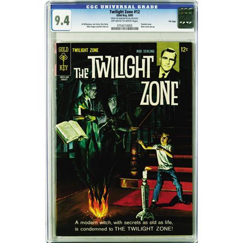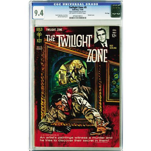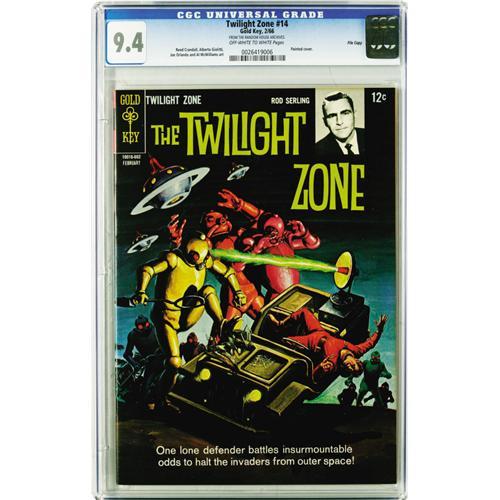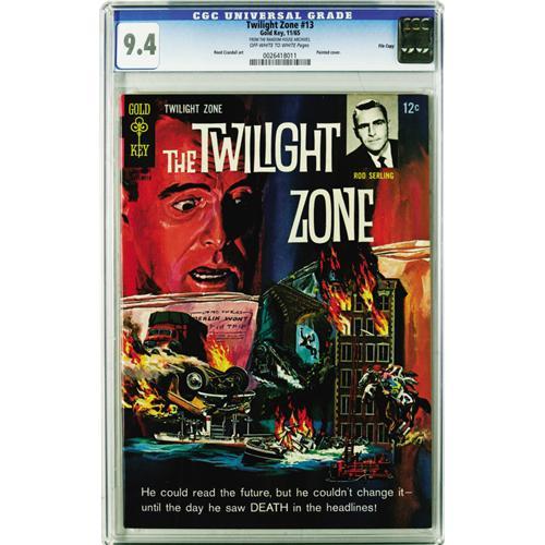<B>Twilight Zone File Copies CGC Group (Gold Key, 1964-73)</B></I>. All issues in this group are CGC 9.4 except for a few 9.6 copies as noted below. All are certified with "off-white to white" page quality unless otherwise noted. Included here are #9 (CGC census 4/06: 5 in 9.4, none higher), #11 (3 in 9.4, 1 higher), #12 (2 in 9.4, none higher), #13 (7 in 9.4, none higher), #14 (5 in 9.4, 3 higher), #15 (3 in 9.4, 2 higher), #17 (2 in 9.4, 2 higher), #19 (7 in 9.4, 2 higher), #21 (5 in 9.4, 5 higher), #22 (off-white pages; 9 in 9.4, none higher), #23 (6 in 9.4, none higher), #24 (off-white pages; 7 in 9.4, none higher), #25 (6 in 9.4, 3 higher), #26 (5 in 9.4, 11 higher), #29 (two copies, both CGC 9.6; 9 in 9.6, none higher), and #48 (white pages; 2 in 9.6, none higher). Overstreet 2006 NM- 9.2 value for group = $855. <I>From the Random House Archives.</B></I>