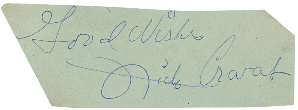 Actor (1912–1994) best known for his appearance as the ‘gremlin’ in the 1963 Twilight Zone episode, ‘Nightmare at 20,000 Feet.’ Scarce vintage ballpoint signature, “Good wishes, Nick Cravat,” on a light green 6.5 x 2.25 slip clipped from an album page. In fine condition, with trivial soiling and the top edge clipped close to the sentiment.