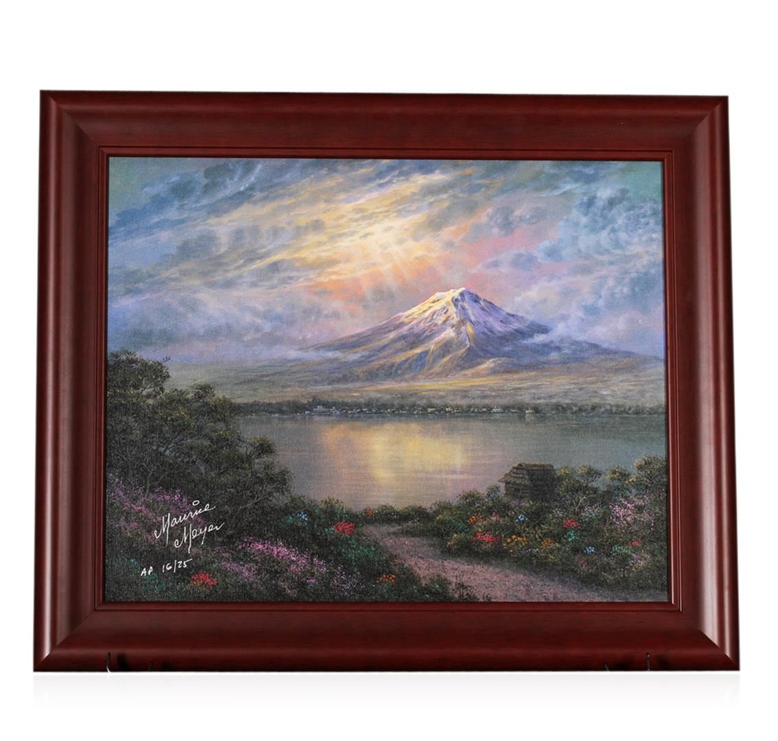 Well-known in Galleries throughout Japan, Maurice Meyer pays homage to the cultural significance of its most sacred mountain , in this signed and numbered limited edition giclee. "Twilight at Fuji" measures 16x20" and it is a signed AP (Artist Proof ) , framed in a minimalist black lacquer molding. Retail is $ 1,000 unframed.His last tour through Tokyo, Osaka, Yokohama and Kyoto, Maurice Meyer brought his tiny brushes and demonstrated his painstaking style to thousands upon thousands of admirers who lined up for hours to meet and greet him. He is a national treasure there as he is here, with paintings selling in Tokyo for three times what they sell for here in the US. Limited Edition S/N Giclee on Canvas # AP 16.