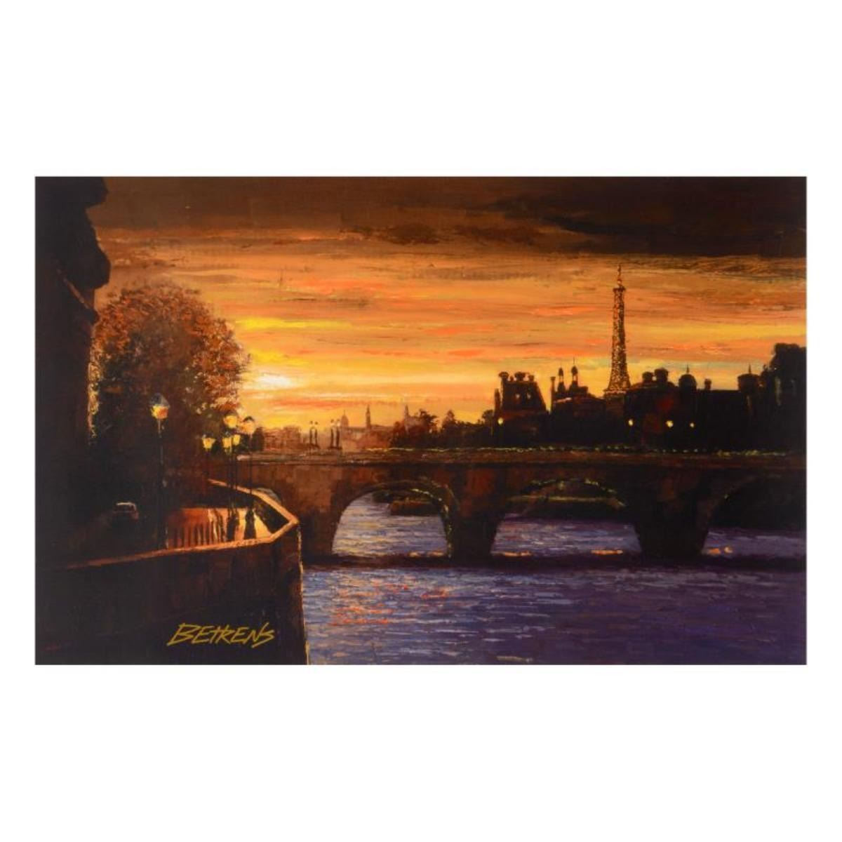 "Twilight on the Seine II" is a limited edition hand embellished giclee on canvas by Howard Behrens (1933-2014), numbered and hand signed by the artist. Includes Certificate of Authenticity. Measures approx. 27" x 17" (image).