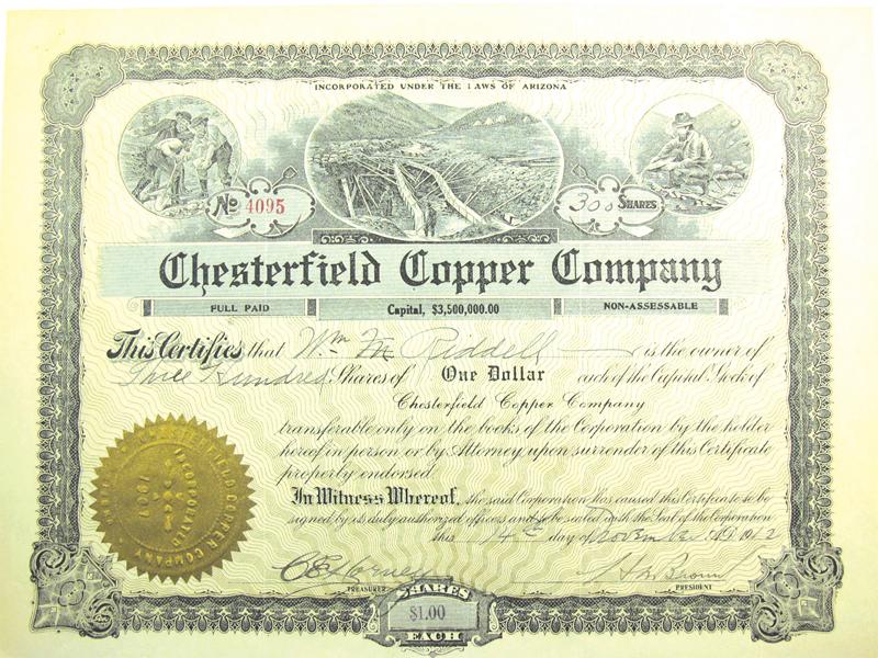 Twin Buttes,AZ - Pima County - November 14, 1912 - Chesterfield Copper Company Stock Certificate Che