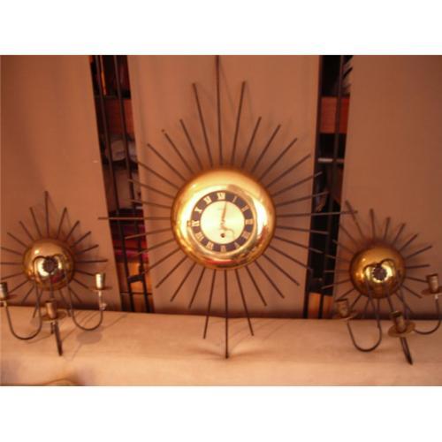 1950?s brass starburst wall clock with twin matching mounted candlestick holders. Very Victorian while being still maintaining the classic starburst design of the 1950?s. Clock is black and brass with roman numeral numbers and two tin sculpted hands. The candlesticks have three arms each curled up ending in a fitted candle cup. They are really original and in terrific condition!