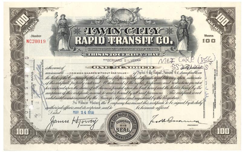 1956, Minnesota. Stock certificate for one hundred shares. Grey / Black. Allegorical females at left and right of company title. Grey underprint and ornate border. Punch and perforation cancelled. Overall Very Fine.