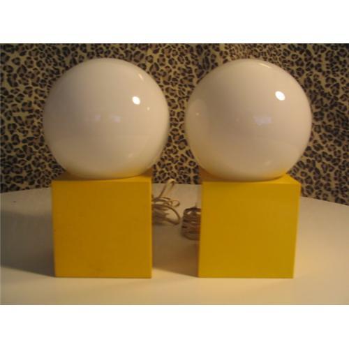 Twin orange Kartell Joe 60?s columbaria lamps with large white bulbs mounted on mod style orange box bases. 5? wide, 11? high