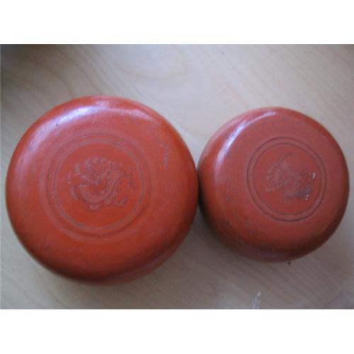 Two rust colored lacquer oriental round strange boxes. One medium sized and one large, the medium box fits inside the large box. Dragon and cloud design on top and bottom, snug fit lid. 6? wide, 4? tall75